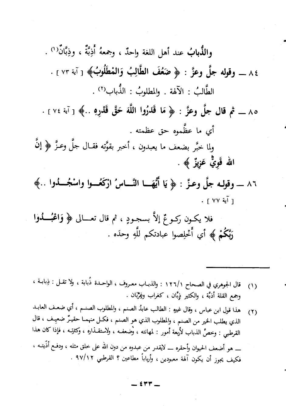 والذباب عند أهل اللغة واحد وجمعه أذبة وذبان 84 - وقوله جل وعز ضعف الطالب والمطلوب آية 73 الطالب الآلهة والمطلوب الذباب 85 - ثم قال جل وعز ما قدروا الله حق قدره آية 74 أي ما عظموه حق عظمته ولما خبر بضعف ما يعبدون أخبر بقوته فقال جل وعز إن الله قوي عزيز 86 - وقوله جل وعز يا أيها الناس اركعوا واسجدوا آية 77 فلا يكون ركوع إلا بسجود ثم قال تعالى واعبدوا ربكم أي أخلصوا عبادتكم لله وحده