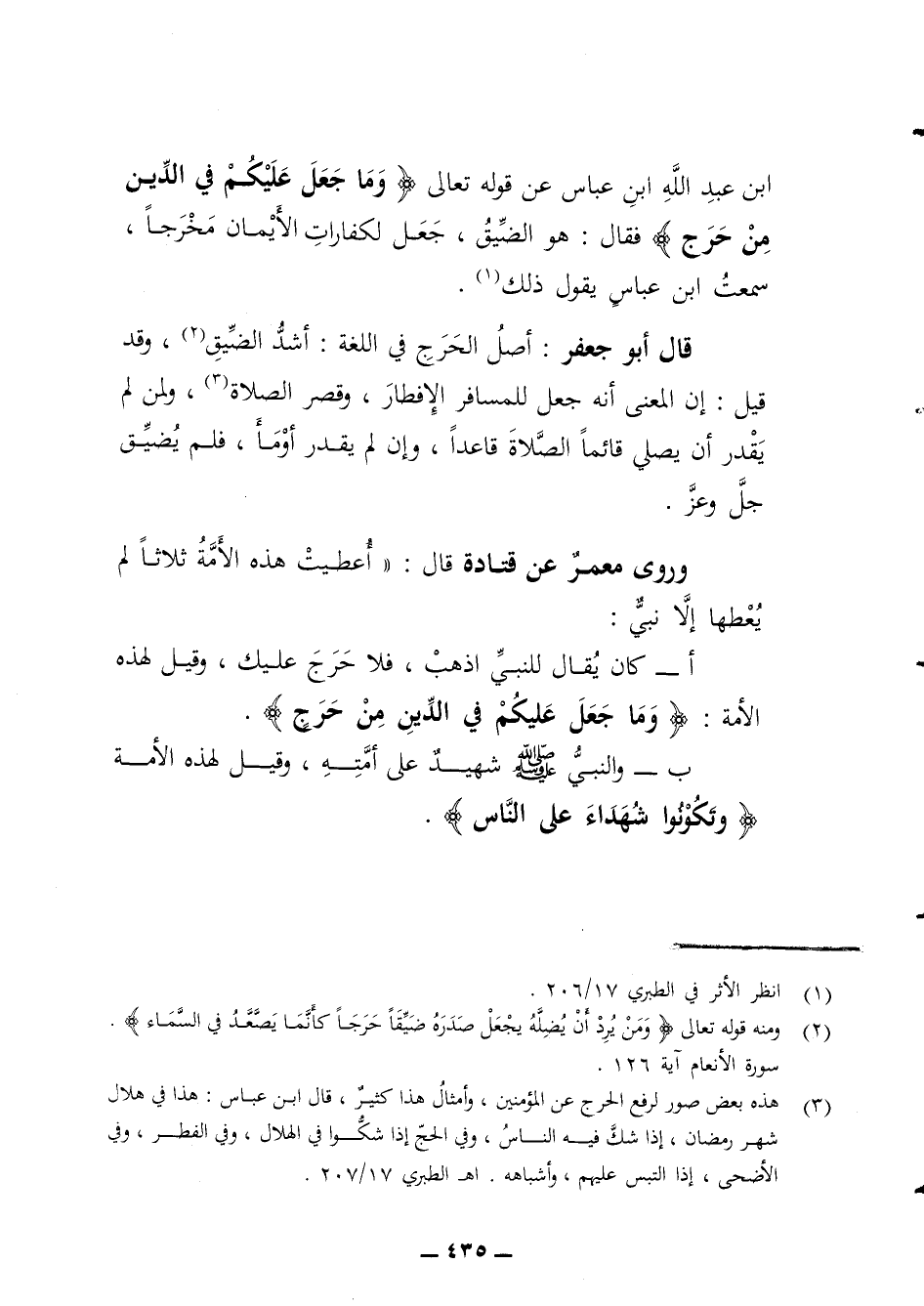 ابن عبد الله ابن عباس عن قوله تعالى وما جعل عليكم في الدين من حرج فقال هو الضيق جعل لكفارات الأيمان مخرجا سمعت ابن عباس يقول ذلك قال أبو جعفر أصل الحرج في اللغة أشد الضيق وقد قيل إن المعنى أنه جعل للمسافر الإفطار وقصر الصلاة ولمن لم يقدر أن يصلي قائما الصلاة قاعدا وإن لم يقدر أوما فلم يضيق جل وعز وروى معمر عن قتادة قال أعطيت هذه الأمة ثلاثا لم يعطها إلا نبي أكان يقال للنبي اذهب فلا حرج عليك وقيل لهذه الأمة وما جعل عليكم في الدين من حرج ب والنبي صلى الله عليه وسلم شهيد على أمته وقيل لهذه الأمة