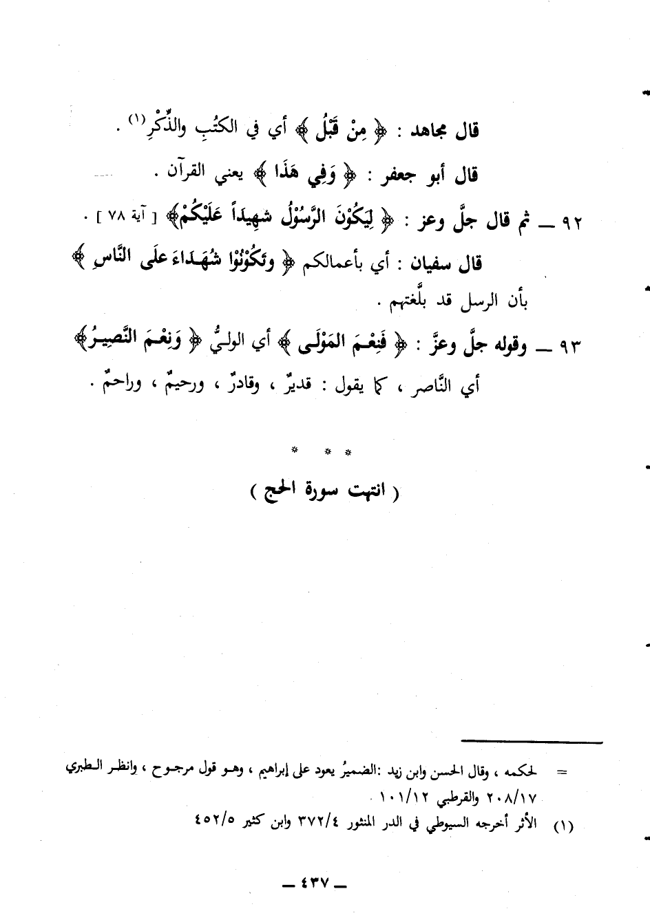 قال مجاهد من قبل أي في الكتب والذكر قال أبو جعفر وفي هذا يعني القرآن 92 - ثم قال جل وعز ليكون الرسول شهيدا عليكم آية 78 قال سفيان أي بأعمالكم وتكونوا شهداء على الناس بأن الرسل قد بلغتهم 93 - وقوله جل وعز فنعم المولى أي الولي ونعم النصير أي الناصر كما يقول قدير وقادر ورحيم وراحم انتهت سورة الحج