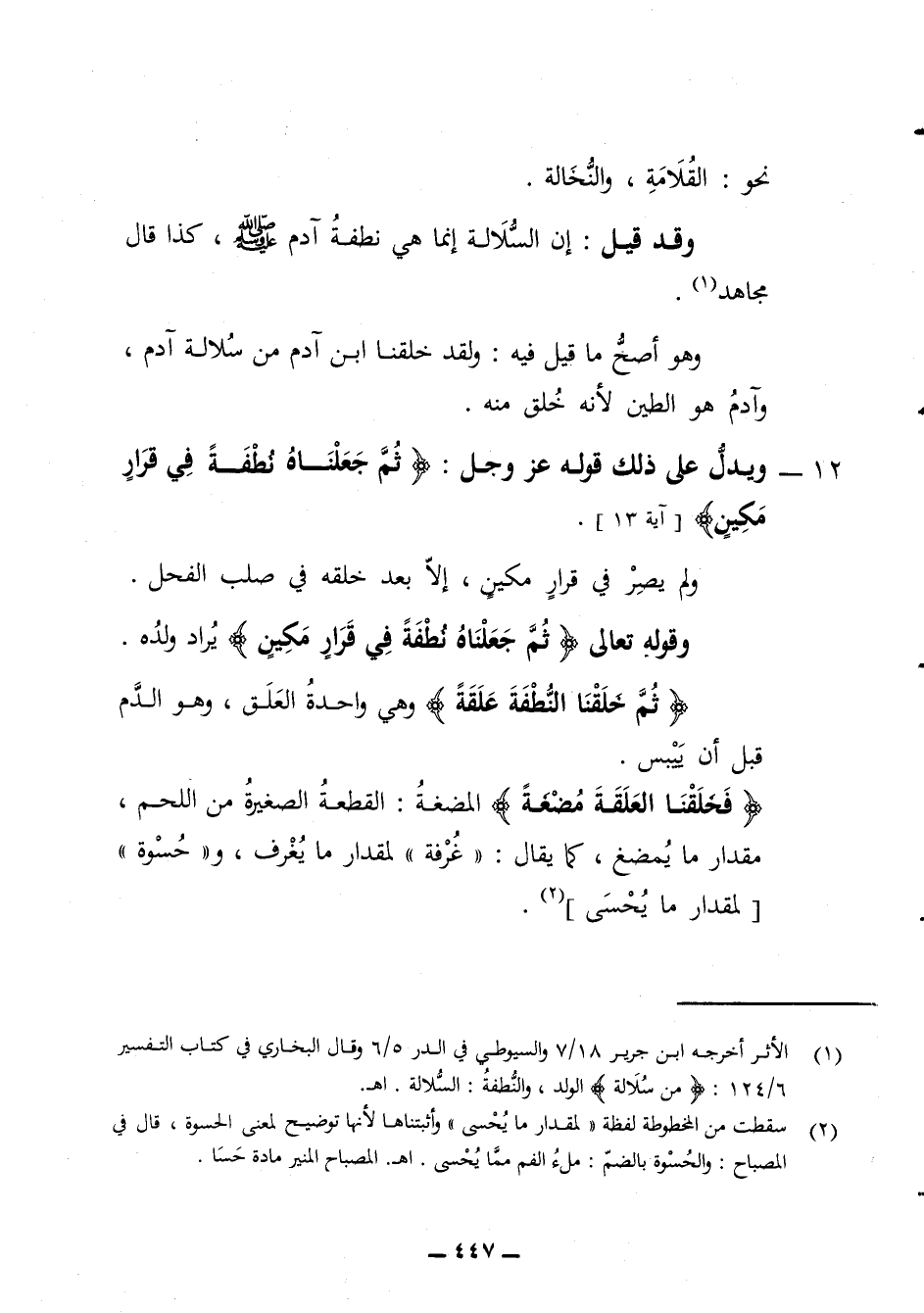 نحو القلامة والنخالة وقد قيل إن السلالة إنما هي نطفة آدم صلى الله عليه وسلم كذا قال مجاهد وهو أصح ما قيل فيه ولقد خلقنا ابن آدم من سلالة آدم وآدم هو الطين لأنه خلق منه 12 - ويدل على ذلك قوله عز وجل ثم جعلناه نطفة في قرار مكين آية 13 ولم يصر في قرار مكين إلا بعد خلقه في صلب الفحل وقوله تعالى ثم جعلنا نطفة في قرار مكين يراد ولده م خلقنا النطفة علقة وهي واحدة العلق وهو الدم قبل أن ييبس فخلقنا العلقة مضغة المضغة القطعة الصغيرة من اللحم مقدار ما يمضغ كما يقال غرفة لمقدار ما يغرف وحسوة لمقدار ما يحسى