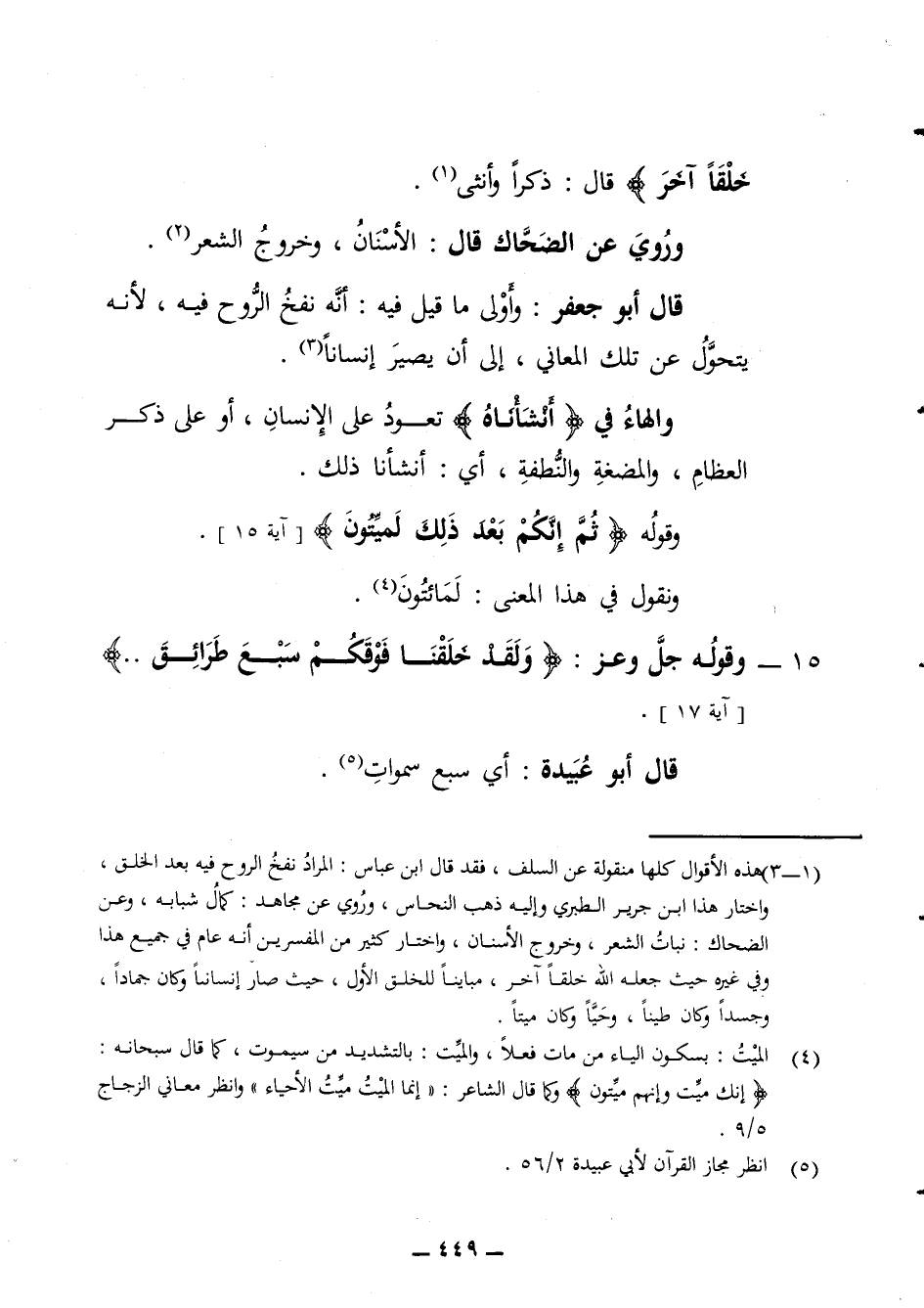 خلقا آخر قال ذكرا وأنثى وروي عن الضحاك قال الأسنان وخروج الشعر قال أبو جعفر واولى ما قيل فيه أنه نفخ الروح فيه لأنه يتحول عن تلك المعاني إلى أن يصير إنسانا والهاء في أنشأناه تعود على الإنسان أو على ذكر العظام والمضغة والنطفة أي أنشأنا ذلك وقوله ثم إنكم بعد ذلك لميتون ونقول في هذا المعنى لمائتون 15 - وقوله جل وعز ولقد خلقنا فوقكم سبع طرائق آية 17 قال أبو عبيدة أي سبع سموات