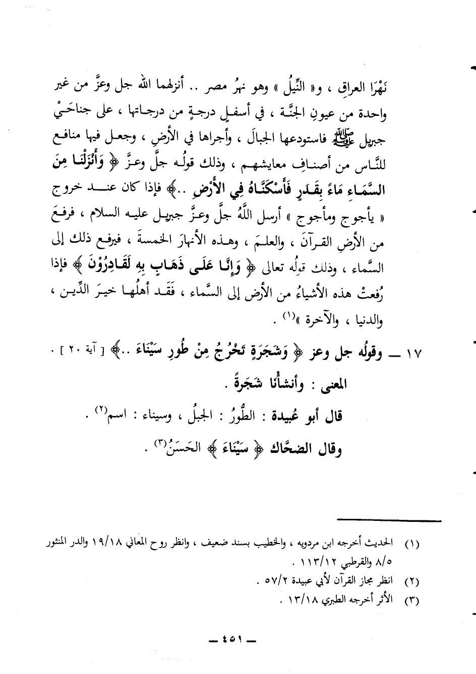نهرا الفرات والنيل وهو نهر مصر أنزلهما الله جل وعز من غير واحدة من عيون الجنة في أسفل درجة من درجاتها على جناحي جبريل صلى الله عليه وسلم فاستودعها الجبال واجراها في الأرض وجعل فيها منافع للناس من أصناف معايشهم وذلك قوله جل وعز وأنزلنا من السماء ماء بقدر فأسكناه في الأرض فإذا كان عند خروج يأجوج ومأجوج أرسل الله جل وعز جبريل عليه السلام فرفع من الأرض القرآن والعلم وهذه الأنهار الخمسة فيرفع ذلك إلى السماء وذلك قوله تعالى وإنا على ذهاب به لقادرون فإذا رفعت هذه الأشياء من الأرض إلى السماء فقد أهلها خير الدين والدنيا والآخرة 17 - وقوله جل وعز وشجرة تخرج من طور سيناء آية 20 المعنى وأنشأنا شجرة قال أبو عبيدة الطور الجبل وسيناء اسم