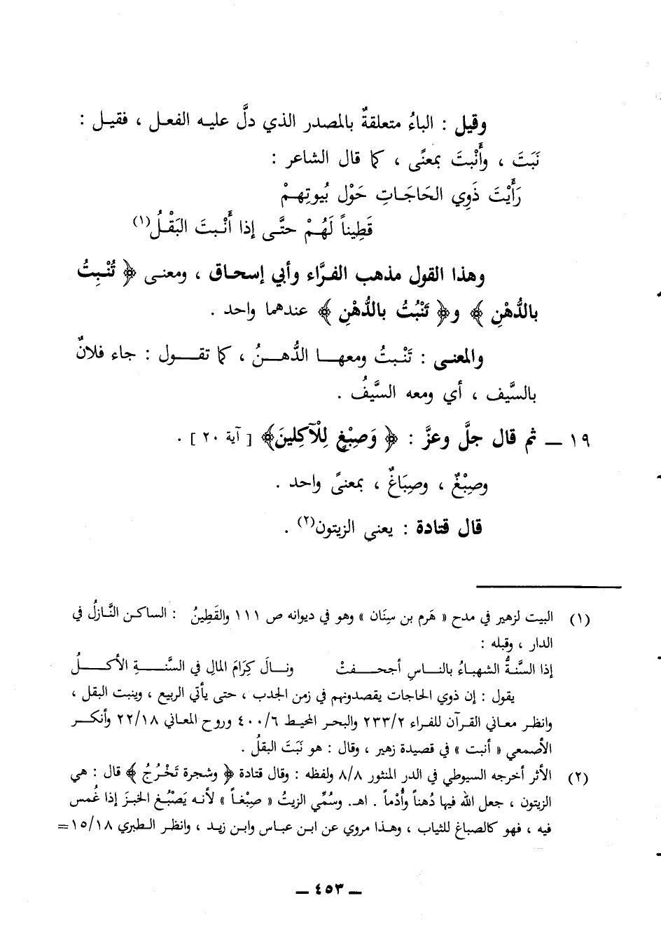 وقيل الباء متعلقة بالمصدر الذي دل عليه الفعل فقيل نبت وأنبت بمعنى كما قال الشاعر رأيت ذوي الحاجات حول بيوتهم قطينا لهم حتى إذا أنبت البقل * وهذا القول مذهب الفراء وأبي إسحاق ومعنى تنبت بالدهن وتنبت بالدهن عندهما واحد والمعنى تنبت ومعها الدهن كما تقول جاء فلان بالسيف أي ومعه السيف 19 - ثم قال جل وعز وصبغ للآكلين آية 20 وصبغ وصباغ بمعنى واحد قال قتادة يعني الزيتون
