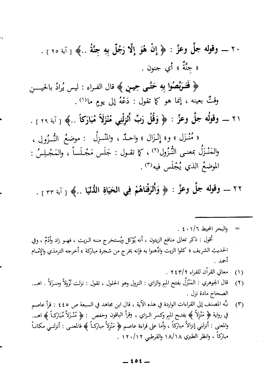 20 - وقوله جل وعز إن هو إلا رجل به جنة آية 25 جنة أي جنون فتربصوا به حتى حين قال الفراء ليس يراد بالحين وقت بعينه انما هو كما تقول دعه إلى يوم ما 21 - وقوله جل وعز وقل رب أنزلني منزلا مباركا آية 29 منزل وإنزال واحد والمنزل موضع النزول والمنزل بمعنى النزول كما تقول جلس مجلسا والمجلس الموضع الذي يجلس فيه 22 - وقوله جل وعز وأترفناهم في الحياة الدنيا آية 33