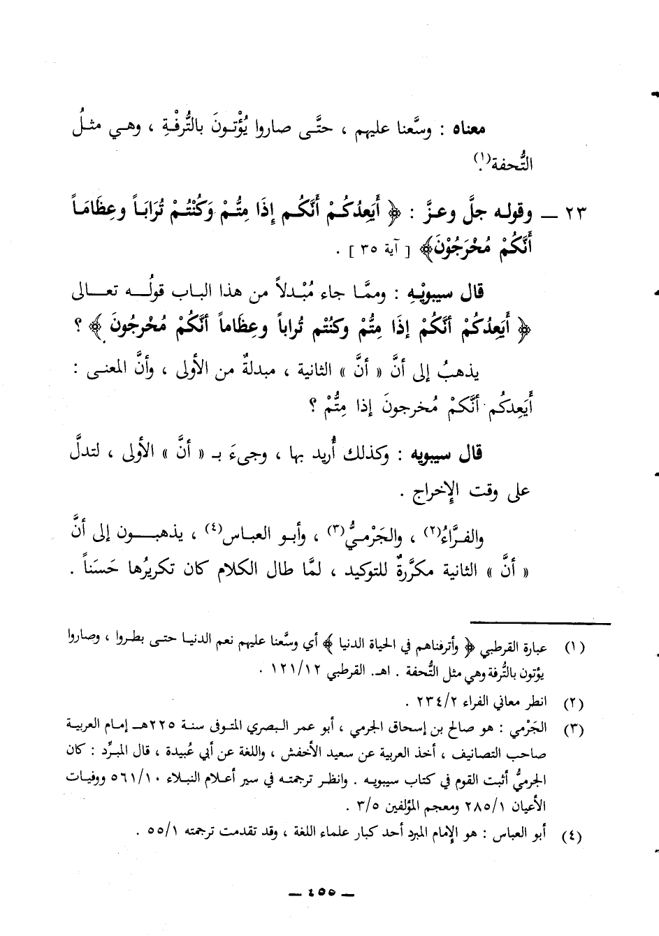 معناه وسعنا عليهم حتى صاروا يؤتون بالترفه وهي مثل التحفة 23 - وقوله جل وعز أيعدكم أنكم إذا متم وكنتم ترابا وعظاما أنكم مخرجون آية 35 قال سيبويه وهما جاء مبدلا من هذا الباب قوله تعالى أيعدكم أنكم إذا متم وكنتم ترابا وعظاما أنكم مخرجون يذهب إلى أن أن الثانية مبدلة من الأولى وأن المعنى عنده أيعدكم أنكم مخرجون إذا متم قال سيبويه وكذلك أريد بها وجئ ب أن الأولى لتدل على وقت الإخراج والفراء والجرمي وابو العباس يذهبون إلى