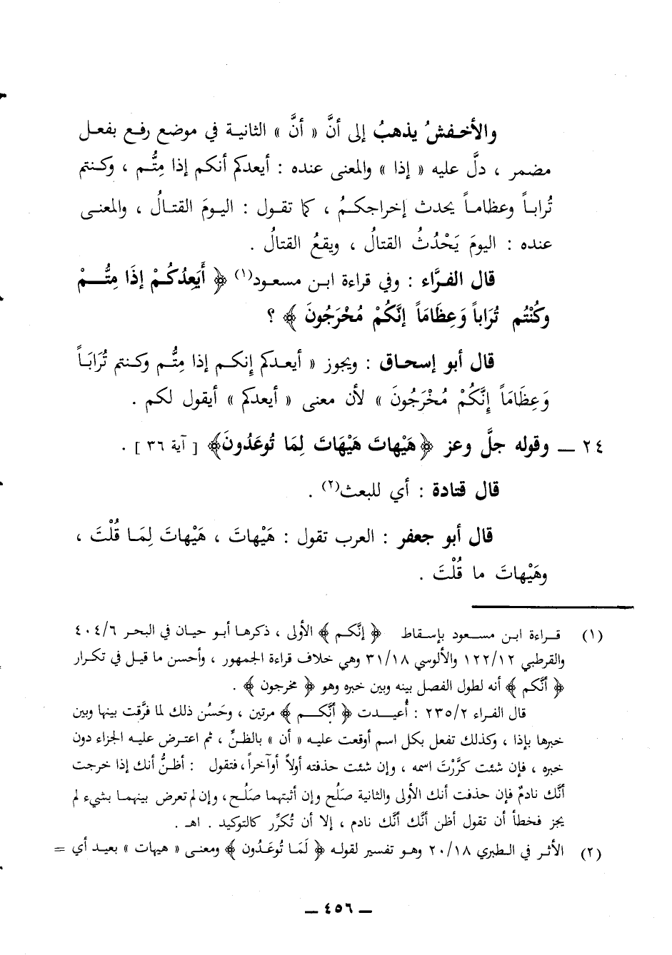 وسلم والأخفش يذهب إلى أن الثانية في موضع رفع بفعل مضمر دل عليه إذا والمعنى أيعدكم أنكم إذا متم وكنتم ترابا وعظاما يحدث إخراجكم كما تقول اليوم القتال والمعنى عنده اليوم يحدث القتال ويقع القتال قال الفراء وفي قراءة ابن مسعود أيعدكم إذا متم وكنتم ترابا وعظاما عنه إنكم مخرجون قال أبو إسحاق ويجوز أيعدكم إنكم إذا متم وكنتم ترابا وعظاما إنكم مخرجون لأن معنى أيعدكم أيقول لكم 24 - وقوله جل وعز هيهات هيهات لما توعدون آية 36 قال قتادة أي للبعث قال أبو جعفر العرب تقول هيهات هيهات لما قلت وهيهات ما قلت