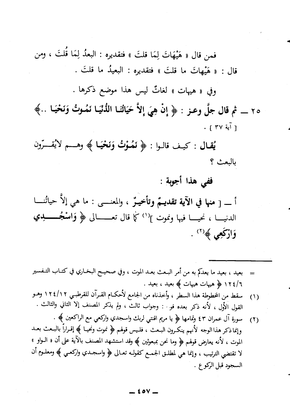 فمن قال هيهات لما قلت فتقديره البعد لما قلت ومن قال هيهات ما قلت فتقديره البعيد ما قلت وفي هيهات لغات ليس هذا موضع ذكرها 25 - ثم قال جل وعز إن هي إلا حياتنا الدنيا نموت ونحيا آية 37 يقال كيف قالوا نموت ونحيا وهم لا يقرون بالبعث