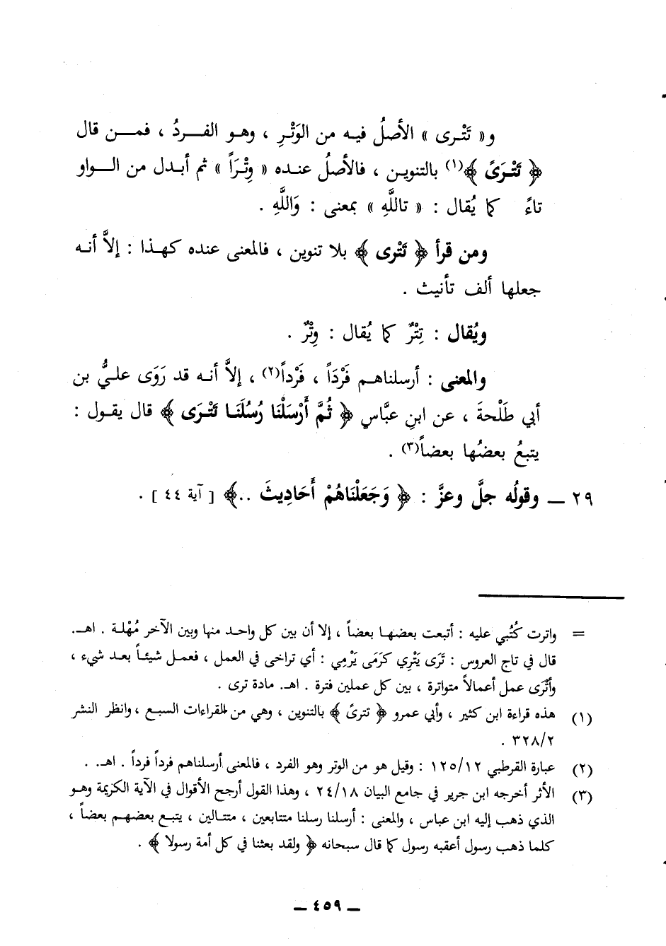 ومن قرأ تترى بلا تنوين فالمعنى عنده كهذا إلا أنه جعلها ألف تأنيث ويقال تتر كما يقال وتر والمعنى أرسلناهم فردا فردا إلا أنه قد روى علي بن أبي طلحة عن ابن عباس ثم أرسلنا رسلنا تترى قال يقول يتبع بعضها بعضا 29 - وقوله جل وعز وجعلناهم أحاديث آية 44