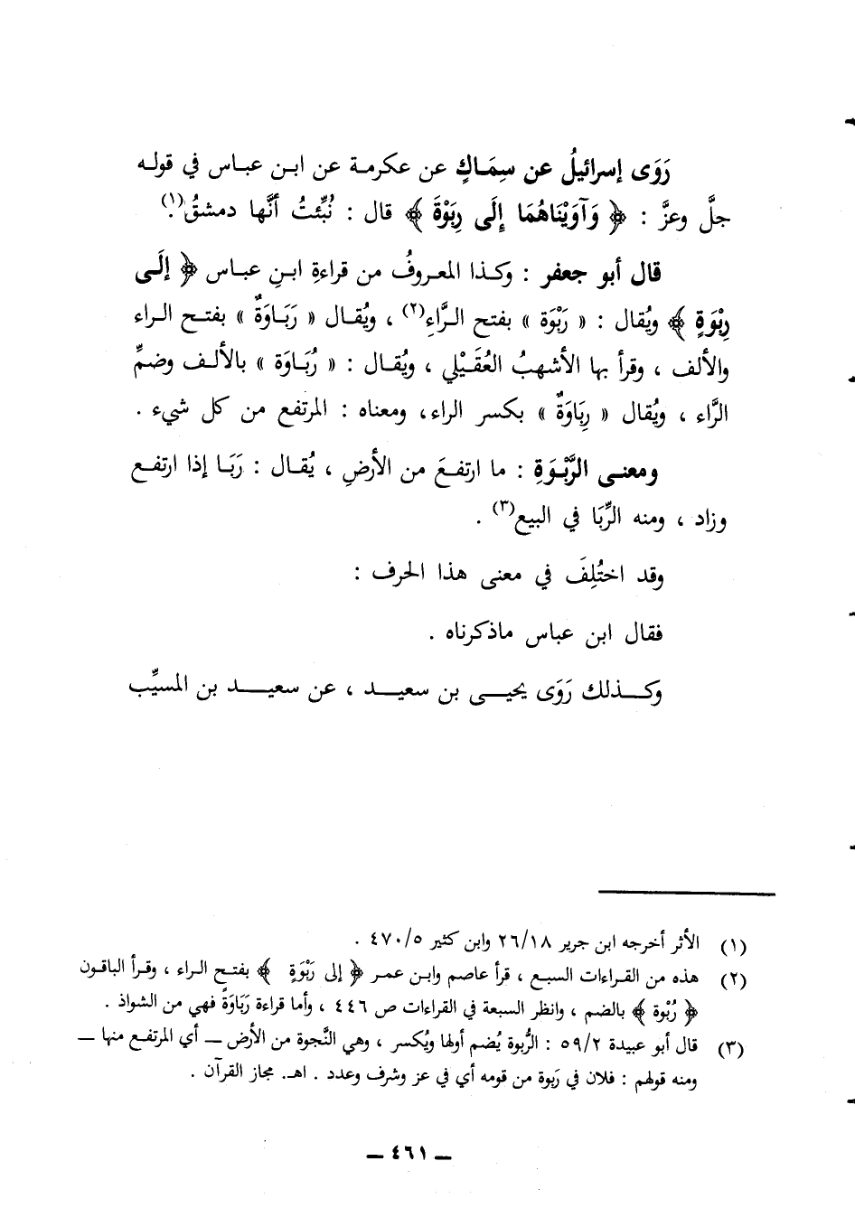 روى إسرائيل عن سماك عن عكرمة عن ابن عباس في قوله جل وعز وآويناهما إلى ربوة قال نبئت أنها دمشق قال أبو جعفر وكذا المعروف من قراءة ابن عباس إلى ربوة ويقال ربوة بفتح الراء ويقال رباوة بفتح الراء