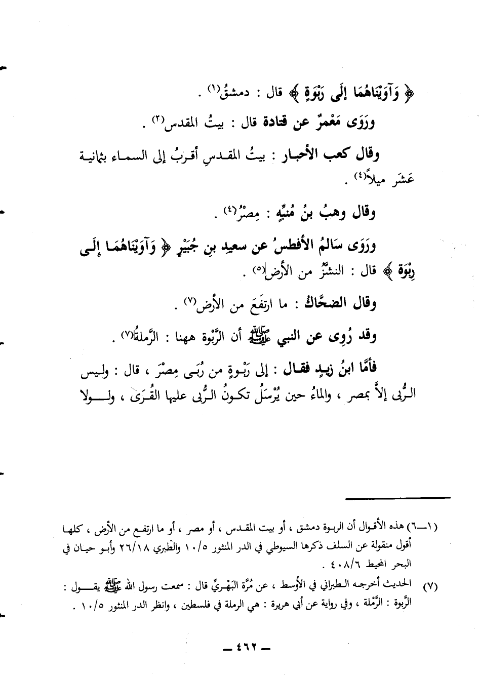 وآويناهما إلى ربوة قال دمشق وروى معمر عن قتادة قال بيت المقدس وقال كعب الأحبار بيت المقدس أقرب إلى السماء بثمانية عشر ميلا وقال وهب بن منبه مصر وروى سالم الأفطس عن سعيد بن جبير وآويناهما إلى ربوة قال النشز من الأرض وقال الضحاك ما ارتفع من الأرض وقد روى عن النبي صلى الله عليه وسلم أن الربوة ههنا الرملة فاما ابن زيد فقال إلى ربوة من ربى مصر قال وليس الربى إلا بمصر والماء حين يرسل تكون الربى عليها القرى ولولا