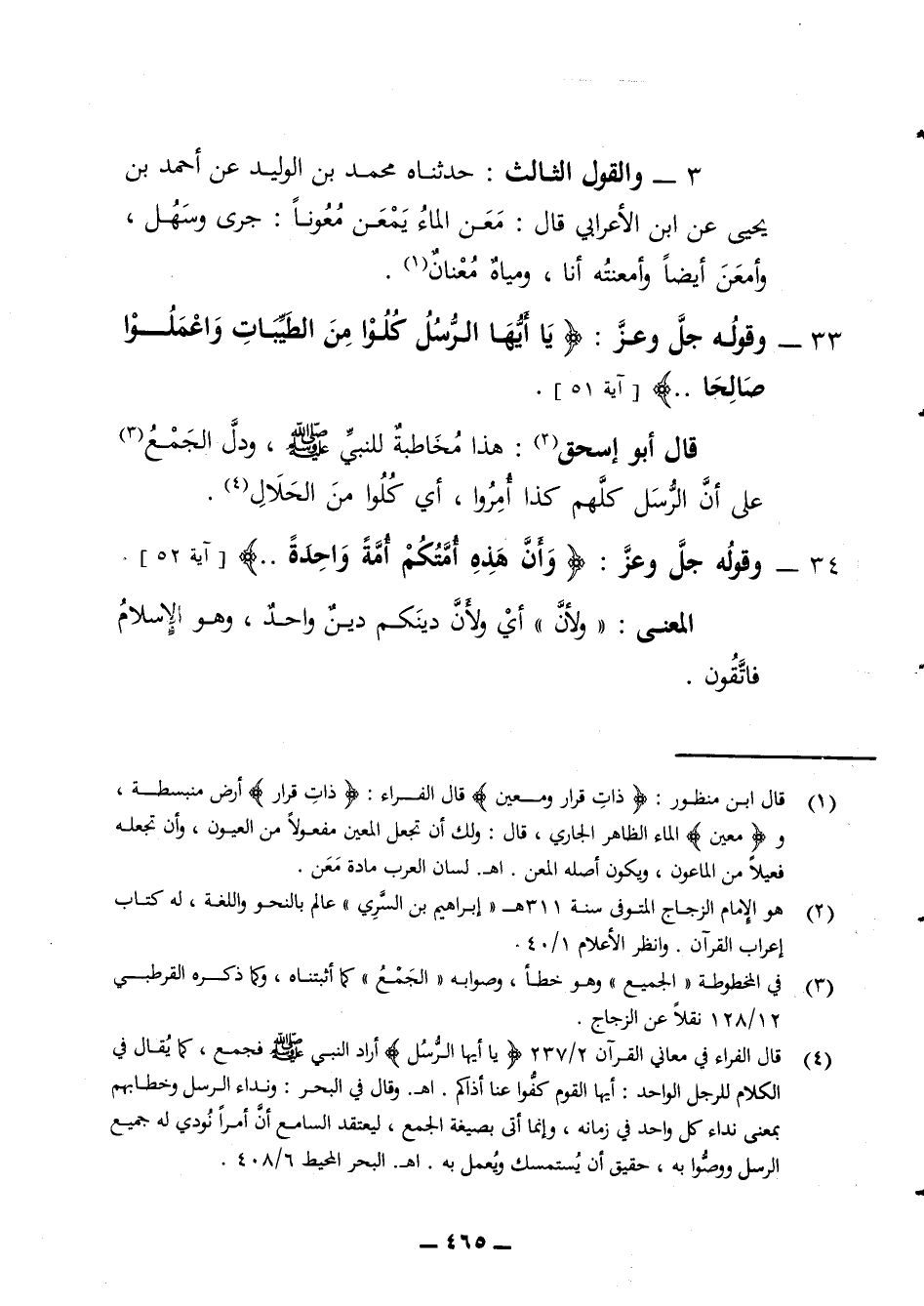 يحيي عن ابن الأعرابي قال معن الماء يمعن معونا جرى وسهل وأمعن أيضا وأمعنته أنا ومياه معنان 33 - وقوله جل وعز يا أيها الرسل كلوا من الطيبات واعملوا صالحا آية 51 قال أبو إسحق هذا مخاطبة للنبي صلى الله عليه وسلم ودل الجمع على أن الرسل كلهم كذا أمروا أي كلوا من الحلال 34 - وقوله جل وعز وأن هذه أمتكم أمة واحدة آية 52 المعنى ولأن أي ولأن دينكم دين واحد وهو الإسلام فاتقون