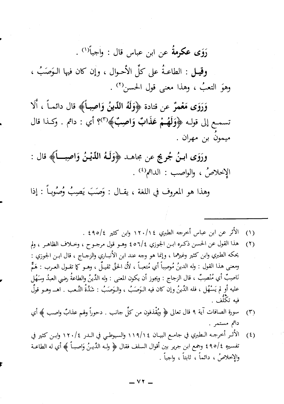 روى عكرمة عن ابن عباس قال واجبا وقيل الطاعة على كل الأحوال وإن كان فيها الوصب وهو التعب وهذا معنى قول الحسن وروى معمر عن قتادة وله الدين واصبا قال دائما ألا تسمع الى قوله ولهم عذاب واصب أي دائم وكذا قال ميمون بن مهران وروى ابن جريج عن مجاهد وله الدين واصبا قال