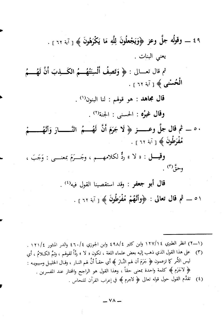 يعني البنات ثم قال تعالى وتصف ألسنتهم الكذب أن لهم الحسنى قال مجاهد هو قولهم لنا البنون وقال غيره الحسنى الجنة 50 - ثم قال جل وعز لا جرم أن لهم النار وأنهم مفرطون وقيل لا رد لكلامهم وجرم بمعنى وجب وحق قال أبو جعفر وقد استقصينا القول فيه 51 - ثم قال تعالى وأنهم مفرطون