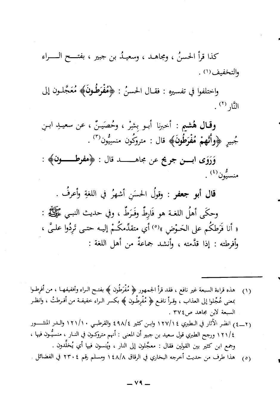كذا قرأ الحسن ومجاهد وسعيد بن جبير بفتح الراء والتخفيف واختلفوا في تفسيره فقال الحسن مفرطون معجلون الى النار وقال هشيم أخبرنا أبو بشر وحصين عن سعيد ابن جبير وأنهم مفرطون قال متروكون منسيون وروى ابن جريح عن مجاهد قال مفرطون منسيون قال أبو جعفر وقول الحسن أشهر في اللغة وأعرف وحكى أهل اللغة هو فارط وفرط وفي حديث النبي (ص)