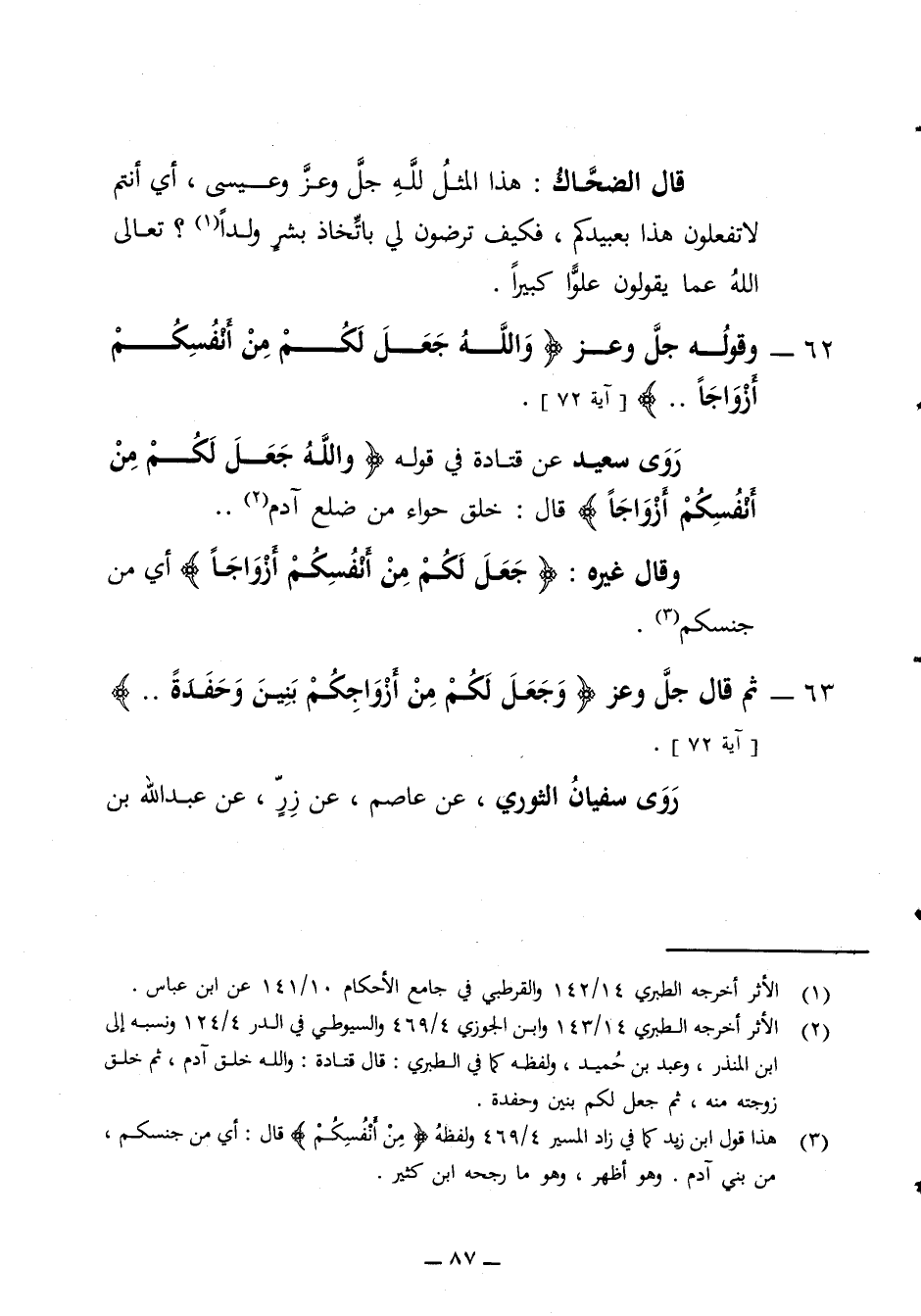 قال الضحاك هذا المثل لله جل وعز وعيسى أي أنتم لا تفعلون هذا بعبيدكم بعد فكيف ترضون لي باتخاذ بشر ولدا تعالى الله عما يقولون علوا كبيرا 62 - وقوله جل وعز والله جعل لكم من أنفسكم أزواجا روى سعيد عن قتادة في قوله والله جعل لكم من أنفسكم أزواجا قال خلق حواء من ضلع آدم وقال غيره جعل لكم من أنفسكم أزواجا أي من جنسكم 63 - ثم قال جل وعز وجعل لكم من أزواجكم بنين وحفدة روى سفيان الثوري عن عاصم عن زر عن عبد الله بن