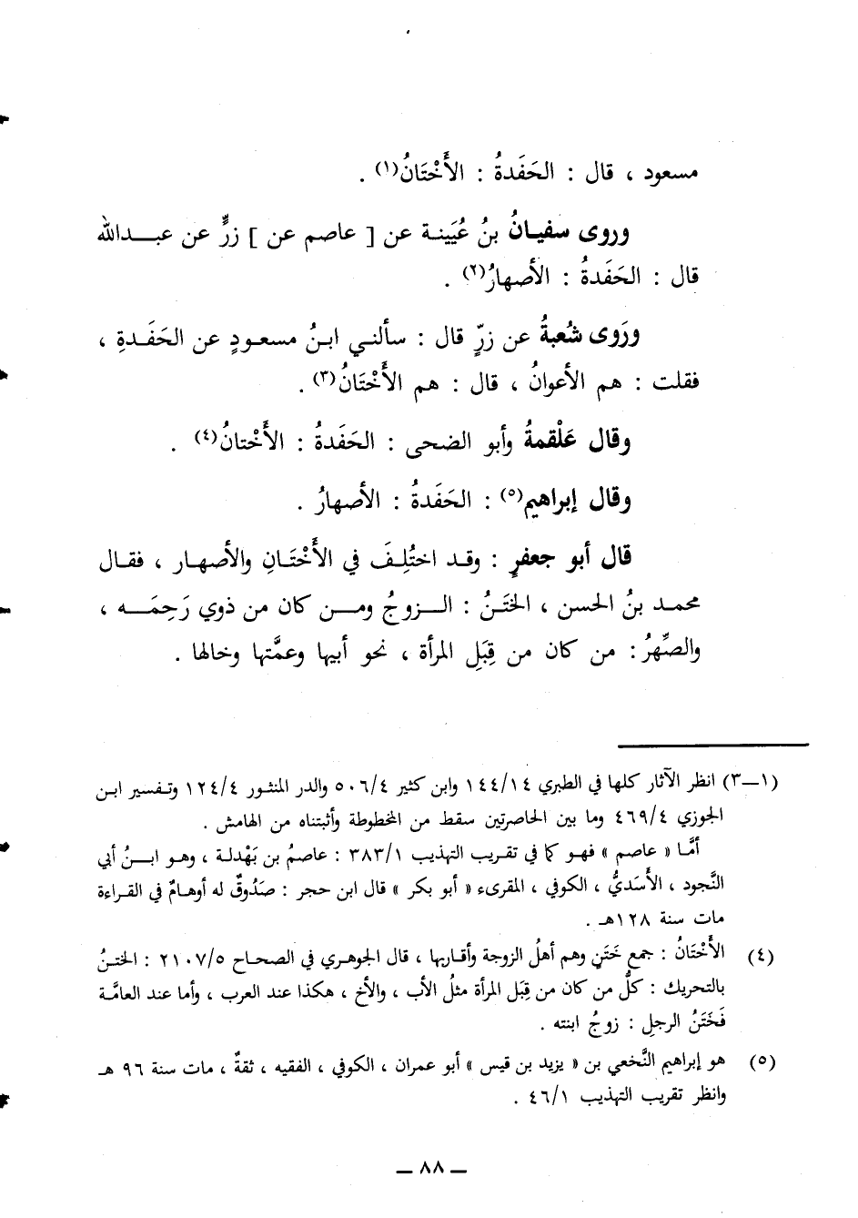 مسعود قال الحفدة الأختان وروى سفيان بن عيينة عن عاصم عن زر عن عبد الله قال الحفدة الأصهار وروى شعبة عن زر قال سألني ابن مسعود عن الحفدة فقلت هم الأعوان قال هم الأختان وقال علقمه وأبو الضحى الحفدة الأختان وقال إبراهيم الحفدة الأصهار قال أبو جعفر وقد اختلف في الأختان والأصهار فقال