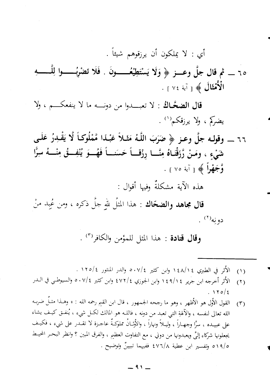 أي لا يملكون أن يرزقوهم شيئا 65 - ثم قال جل وعز ولا يستطيعون فلا تضربوا لله الأمثال قال الضحاك لا تعبدوا من دونه ما لا ينفعكم ولا يضركم ولا يرزقكم 66 - وقوله جل وعز ضرب الله مثلا عبدا مملوكا لا يقدر على شئ ومن رزقناه منا رزقا حسنا فهو ينفق منه سرا وجهرا هذه الآية مشكلة وفيها أقوال قال مجاهد والضحاك هذا المثل لله جل ذكره ومن عبد من دونه وقال قتادة هذا المثل للمؤمن والكافر