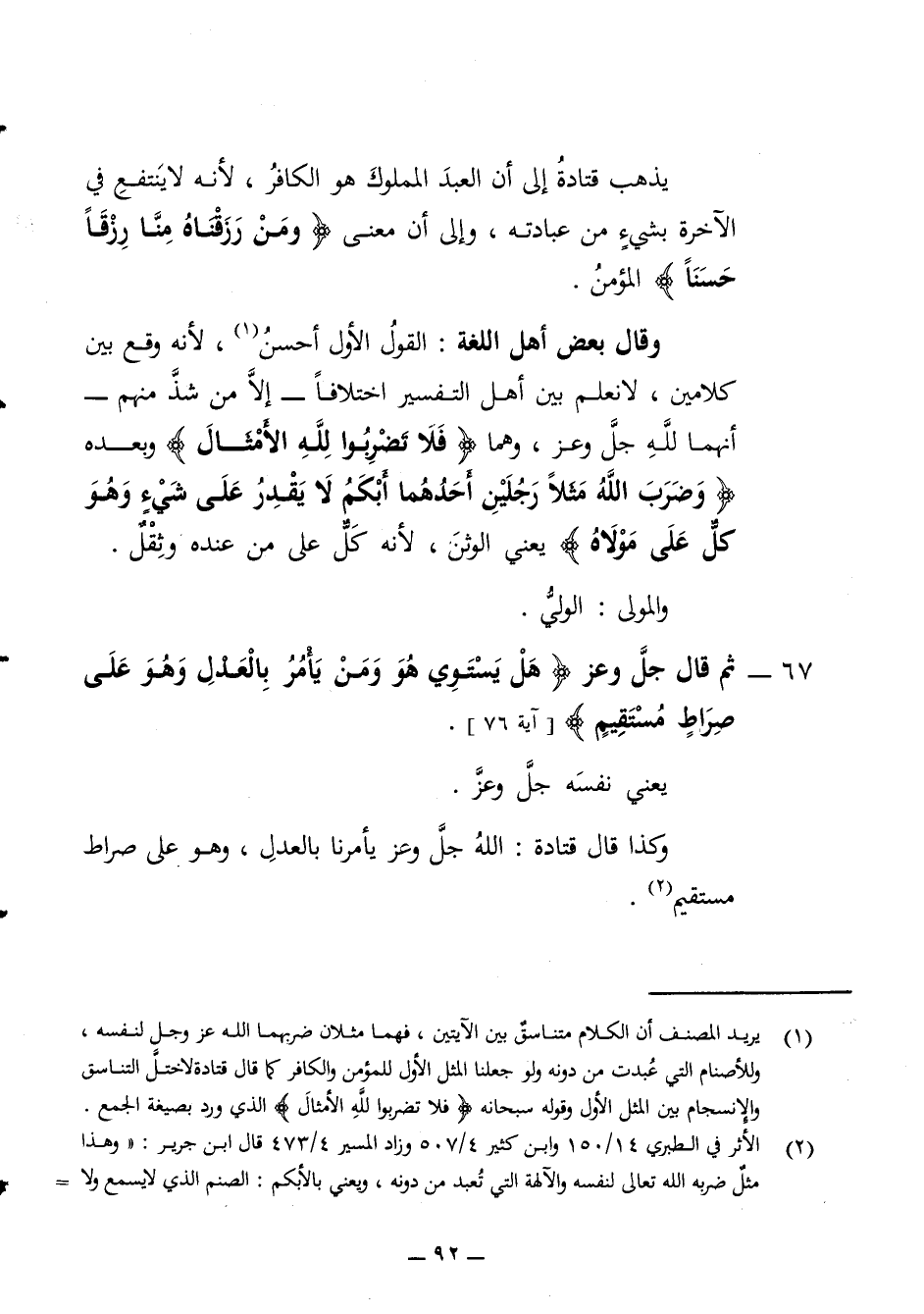 كلامين لا نعلم بين أهل التفسير اختلافا إلا من شذ منهم انهما لله جل وعز وهما فلا تضربوا لله الأمثال وبعده وضرب الله مثلا رجلين أحدهما أبكم لا يقدر على شئ وهو كل على مولاه يعني الوثن لأنه كل على من عنده وثقل والمولى الولي 67 - ثم قال جل وعز هل يستوي هو ومن يأمر بالعدل وهو على صراط مستقيم يعني نفسه جل وعز وكذا قال قتادة الله جل وعز يأمرنا بالعدل وهو على صراط مستقيم