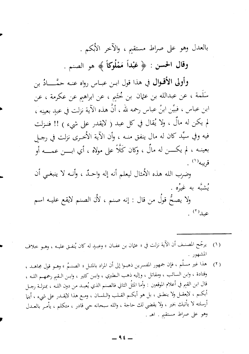 بالعدل وهو على صراط مستقيم والآخر الأبكم وقال الحسن عبدا مملوكا هو الصنم وأولى الأقوال في هذا قول ابن عباس رواه عنه حماد بن سلمة عن عبد الله بن عثمان بن خثيم عن ابراهيم عن عكرمة عن ابن عباس فبين ابن عباس رحمه الله أن هذه الآية نزلت في عبد بعينه لم يكن له مال ولا يقال في كل عبد لا يقدر على شئ فنزلت فيه وفي سيد كان له مال ينفق منه وأن الآية الأخرى نزلت في رجل بعينه لم يكن له مال وكان كلا على مولاه أي ابن عمه أو قريبه وضرب الله هذه الأمثال ليعلم أنه إله واحد وأنه لا ينبغي أن يشبه به غيره ولا يصح قول من من قال إنه صنم لأن الصنم لا يقع عليه اسم عبد