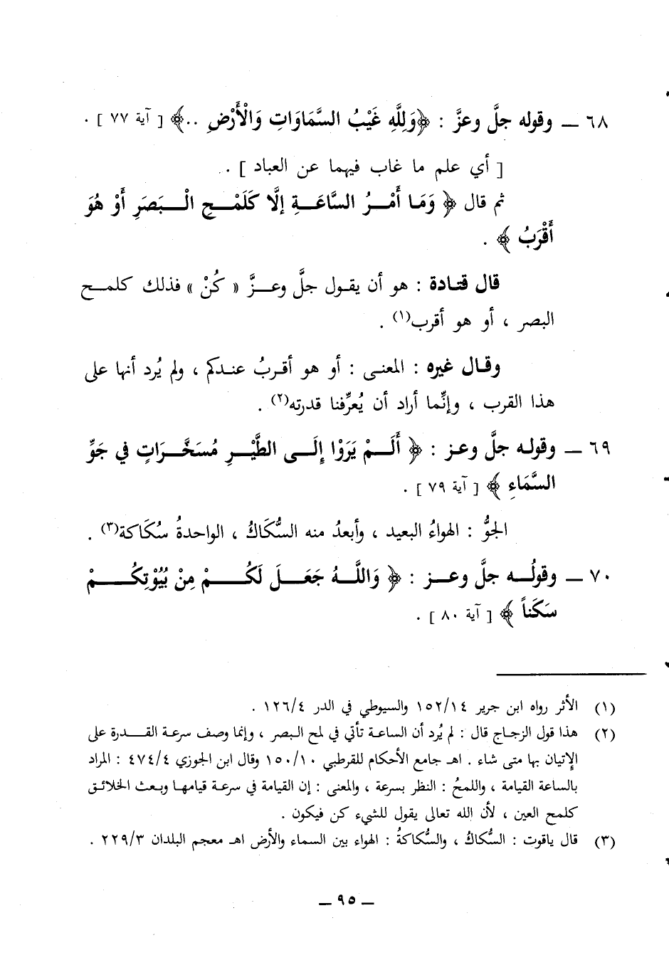 وقال غيره المعنى أو هو أقرب عندكم ولم يرد أنها على هذا القرب وانما أراد أن يعرفنا قدرته 69 - وقوله جل وعز ألم يروا الى الطير مسخرات في جو السماء الجو الهواء البعيد وأبعد منه السكاك الواحدة سكاكة 70 - وقوله جل وعز والله جعل لكم من بيوتكم سكنا