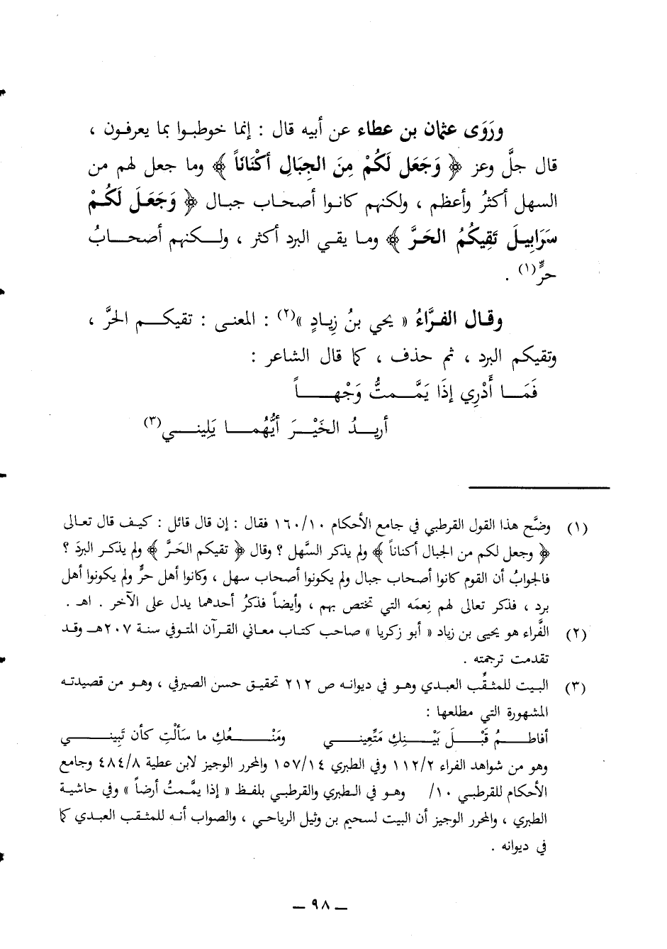 وروى عثمان بن عطاء عن أبيه قال إنما خوطبوا بما يعرفون قال جل وعز وجعل لكم من الجبال أكنانا وما جعل لهم من السهل أكثر وأعظم ولكنهم كانوا أصحاب جبال وجعل لكم سرابيل تقيكم الحر وما يقي البرد أكثر ولكنهم أصحاب حر وقال الفراء يحي بن زياد المعنى تقيكم الحر وتقيكم البرد ثم حذف كما قال الشاعر * فما أدري إذا يممت وجها *
