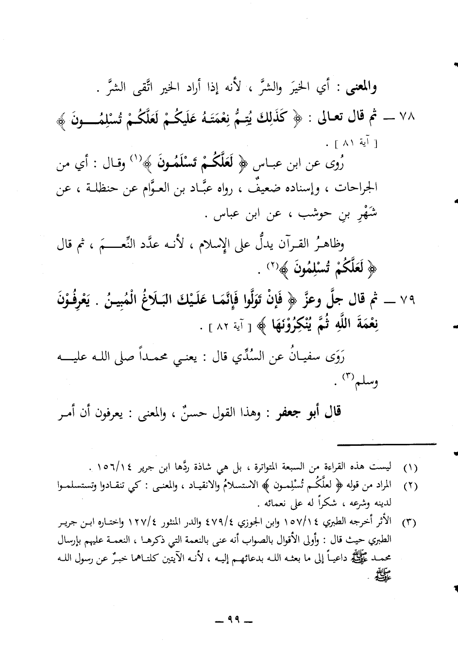 والمعنى أي الخير والشر لأنه إذا أراد الخير أتقى الشر 78 - ثم قال تعالى كذلك يتم نعمته عليكم لعلكم تسلمون روى عن ابن عباس لعلكم تسلمون وقال أي من الجراحات وإسناده ضعيف رواه عباد بن العوام عن حنظلة عن شهر بن حوشب عن ابن عباس وظاهر القرآن يدل على الإسلام لأنه عدد النعم ثم قال لعلكم تسلمون 79 - ثم قال جل وعز فإن تولوا فإنما عليك البلاغ المبين يعرفون نعمة الله ثم ينكرونها روى سفيان عن السدي قال يعني محمدا (ص) قال أبو جعفر وهذا القول حسن والمعنى يعرفون أن امر