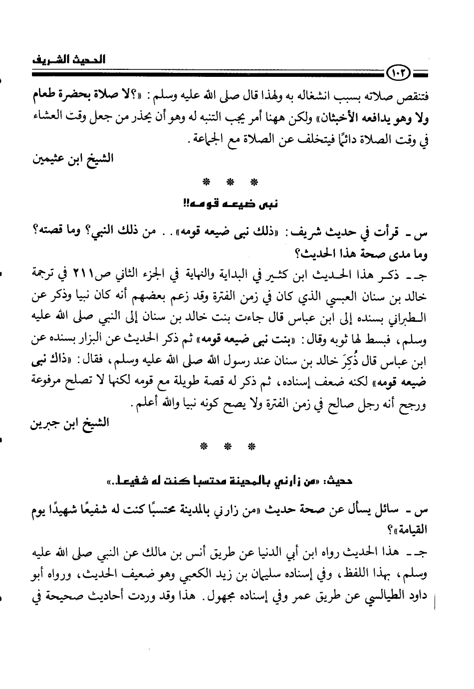 ج- ذكر هذا الحديث ابن كثير في البداية والنهاية في الجزء الثاني ص211 في ترجمة خالد بن سنان العيسي الذي كان في زمن الفترة وقد زعم بعضهم أن كان نبينا وذكر عن الطبراني بسنده إلى أن عباس قال جاءت بنت خالد بن سنان إلى النبي، - صلى الله عليه وسلم -، فبسط لها ثوبه وقال {بنت نبي ضيعه قومه} ثم ذكر الحديث عن البزار بسنده عن ابن عباس قال ذُكِرَ خالد بن سنان عند رسول الله، - صلى الله عليه وسلم -، فقال {ذالك نبي ضيعه قومه} لكنه ضعف إسناده، ثم ذكر له قصة طويلة مع قومه لكنها لا تصلح مرفوعة ورجع أنه رجل صالح في زمن الفترة ولا يصح كونه نبيا والله أعلم.