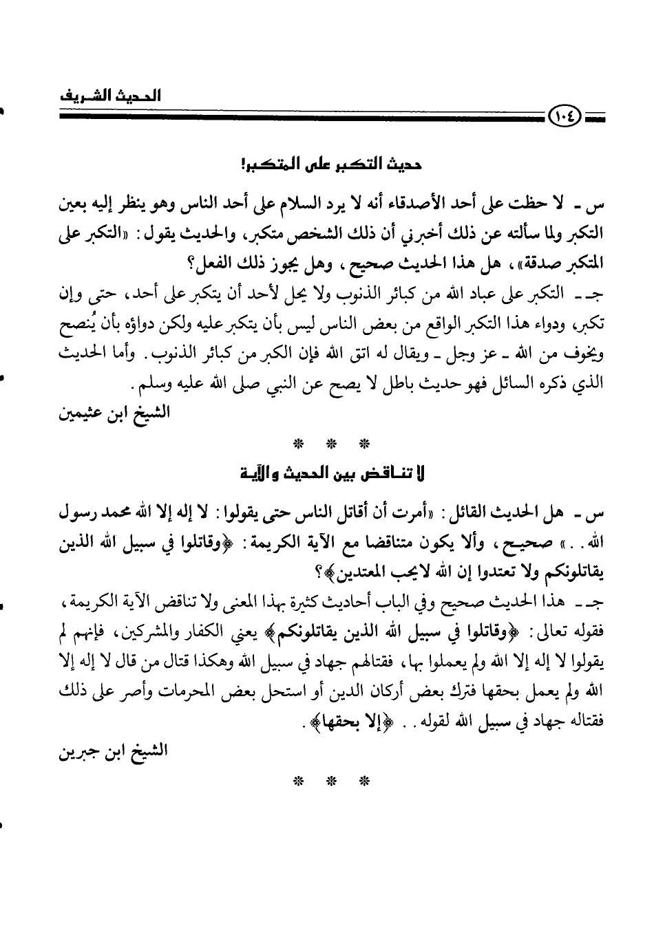 ج- هذا الحديث صحيح وفي الباب أحاديث كثيرة بهذا المعنى ولا تناقض الآية الكريمة، فقوله تعالى {وقاتلوا في سبيل الله الذين يقاتلونكم} يعني الكفار والمشركين، فإنهم لم يقولوا لا إله إلا الله ولم يعملوا بها، فقتالهم جهاد في سبيل الله وهكذا قتال من قال لا إله إلا الله ولم يعمل بحقها فترك بعض أركان الدين أو استحل بعض المحرمات وأصر على ذلك فقتاله جهاد في سبيل الله لقوله.. {إلا بحقها} .