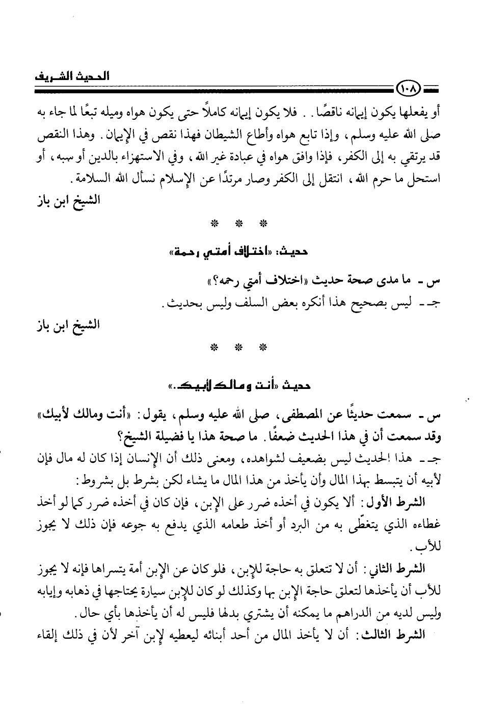 ج- هذا الحديث ليس بضعيف لشواهده، ومعنى ذلك أن الإنسان إذا كان له مال فإن لابيه أن يتبسط بهذا المال وأن يأخذ من هذا المال ما يشاء لكن بشرط بل بشروط