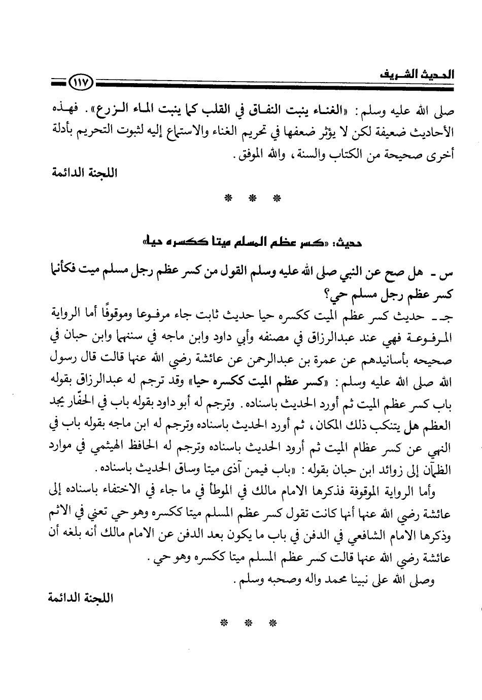 ج- حديث كر عظم الميت ككسره حيا حديث ثابت جاء مرفوعاً وموقوفاً أما الرواية المرفوعة فهي عند عبد الرزاق في مصنفه وأبي داود وابن ماجه في سننهما وابن حبان في صحيحه بأسانديهم عن عمرة بن عبد الرحمن عن عائشة رضي الله عنها قالت قال رسول الله، - صلى الله عليه وسلم -، {كسر عظم الميت ككسره حيا} وقد ترجم له عبد الرزاق بقوله باب كسر عظم الميت ثم أورد الحديث باسناده، وترجم له أبو داود بقول باب في الحفار يجد العظم هل يتنكب ذلك المكان، ثم أورد الحديث بإسناده وترجم له ابن ماجه بقوله باب في النهي عن كسر عظام الميت ثم أرود الحديث بإسناده وترجم له الحافظ الهيثمي في موارد الظمآن إلى زوائد ابن حبان بقوله باب فيمن آذى ميتا وساق الحديث بإسناده.
