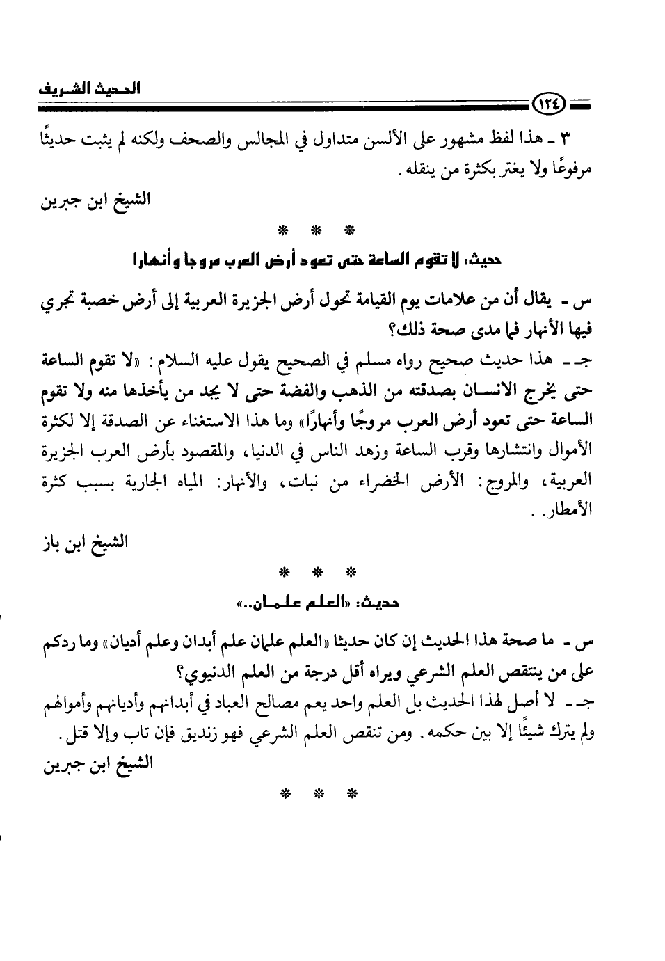 ج- هذا حديث صحيح رواه مسلم في الصحيح يقول عليه السلام {لا تقوم الساعة حتى يخرج الإنسان بصدقته من الذهب والفضة حتى لا يجد من يأخذها منه ولا تقوم الساعة حتى تعود أرض العرب مروجاً وأنهاراً} وما هذا الاستغناء عن الصدقة إلا لكثرة الأموال وانتشارها وقرب الساعة وزهد الناس في الدنيا، والمقصود بأرض العرب الجزيرة العربية، والمروج الأرض الخضراء من نبات، والأنهار المياه الجارية بسبب كثرة الأمطار.
