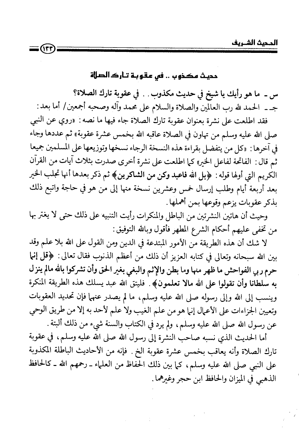 أما الحديث الذي نسبه صاحب النشرة إلى رسول الله، - صلى الله عليه وسلم -، في عقوبة تارك الصلاة وأنه يعاقب بخمس عشرة عقوبة.. إلخ. فإنه من الأحاديث الباطلة المكذوبة على النبي، - صلى الله عليه وسلم -، كما بين ذلك الحفاظ من العلماء - رحمهم الله - كالحافظ الذهبي في الميزان والحافظ ابن حجر وغيرهما.