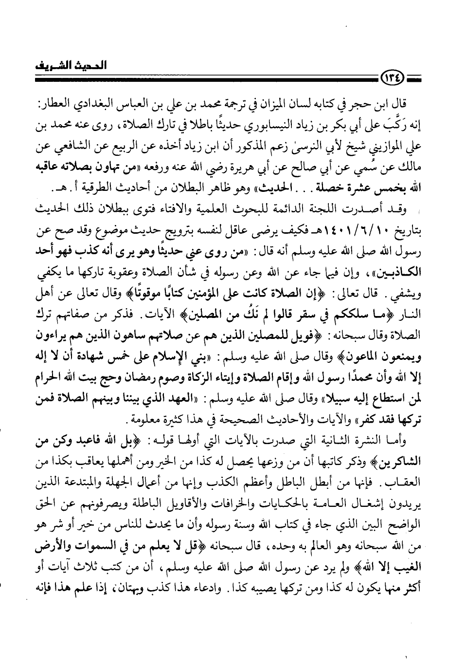 وقد أصدرت اللجنة الدائمة للبحوث العلمية والافتاء فتوى ببطلان ذلك الحديث بتاريخ 10 6 1401هـ فكيف يرضي عاقل لنفسه بترويج حديث موضوع وقد صح عن رسول الله، - صلى الله عليه وسلم -، أنه قال {من روى عني حديثاً وهو يرى أنه كذب فهو أحد الكاذبين} ، وإن فيما جاء عن الله وعن رسوله في شأن الصلاة وعقوبة تاركها ما يكفي ويشفي. قال تعالى {إن الصلاة كانت على المؤمنين كتاباً موقوتاً} وقال تعالى عن أهل النار {" ما سلككم في سفر قالوا لم نَكُ من المصلين} الآيات. فذكر من صفاتهم ترك الصلاة وقال سبحانه {فويل للمصلين الذين هم عن صلاتهم ساهون الذين هم يراءون ويمنعون الماعون} وقال، - صلى الله عليه وسلم -، {بني الإسلام على خمس شهادة أن لا إله إلا الله وأن محمداً رسول الله وإقامة الصلاة وإيتاء الزكاة وصوم رمضان وحج بيت الله الحرام لمن استطاع إليه سبيلاً} وقال، - صلى الله عليه وسلم -، {العهد الذي بيننا وبينهم الصلاة فمن تركها فقد كفر} والآيات والأحاديث الصحيحة في هذا كثيرة معلومة.