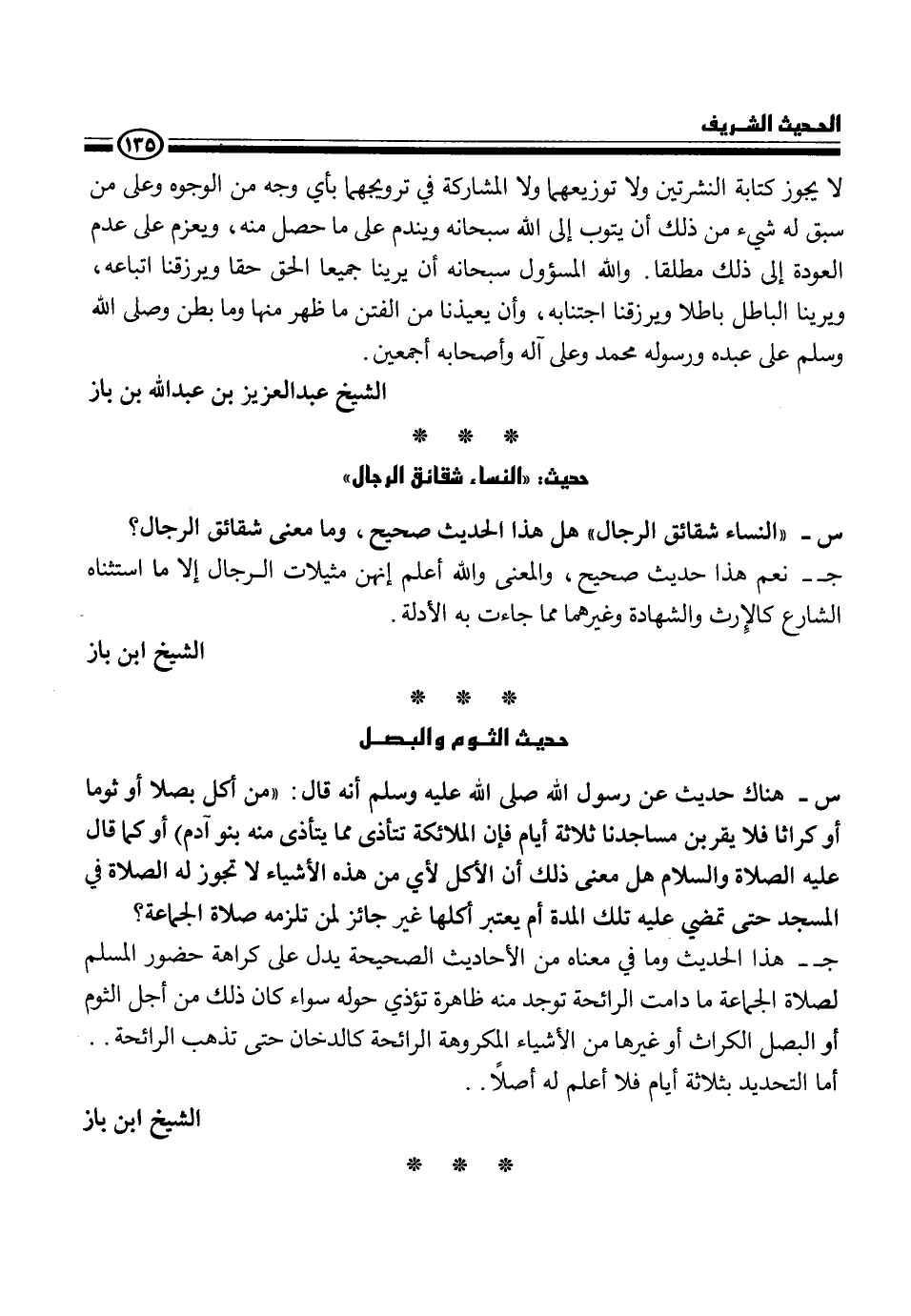 س - هناك حديث عن رسول الله، - صلى الله عليه وسلم -، أنه قال {من أكل بصلا أو ثوما أو كراثا فلا يقربن مساجدنا ثلاثة أيام فإن الملائكة تتأذى مما يتأذى منه بنو آدم} أو كما قال عليه الصلاة والسلام هل معنى ذلك أن الأكل لأي من هذه الأشياء لا تجوز له الصلاة في المسجد حتى تمضي عليه تلك المدة أم يعتبر أكلها غير جائز لمن تلزمه صلاة الجماعة؟