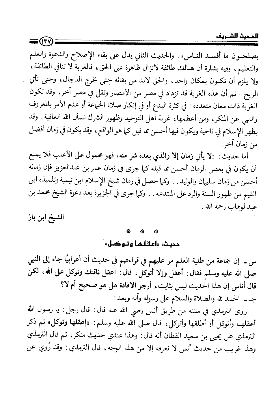 س - إن جماعة من طلبة العلم مر عليهم في قراءتهم في حديث أن أعرابياً جاء إلى النبي، - صلى الله عليه وسلم -، فقال {أعقل وإلا أتوكل، قال اعقل ناقتك وتوكل على الله} ، لكن قال الناس إن هذا الحديث ليس بثابت، أرجو الإفادة هل هو صحيح أم لا؟