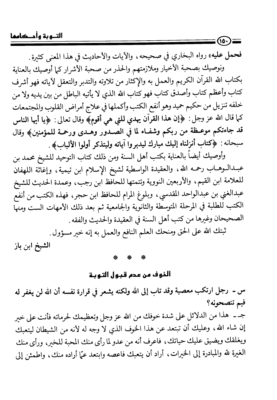 ونوصيك بصحبه الأخيار وملازمتهم والحذر من صحبة الأشرار كما أوصيك بالعناية بكتاب الله القرآن الكريم والعمل به والإكثار من تلاوته والتدبر والتعقل لآياته فهو أشرف كتاب وأعظم كتاب وأصدق كتاب فهو كتاب الله الذي لا يأتيه الباطل من بين يديه ولا من خلفه تنزيل من حكيم حميد وهو أنفع الكتب وأكملها في علاج أمراض القلوب والمجتمعات كما قال الله عز وجل {إن هذا القرآن يهدي للتي هو أقوم} وقال تعالى {يا أيها الناس قد جاءتكم موعظة من ربكم وشفاء لما في الصدور وهدى ورحمة للمؤمنين} وقال سبحانه {كتاب انزلناه إليك مبارك ليدبروا آياته وليتذكر أولوا الألبات}