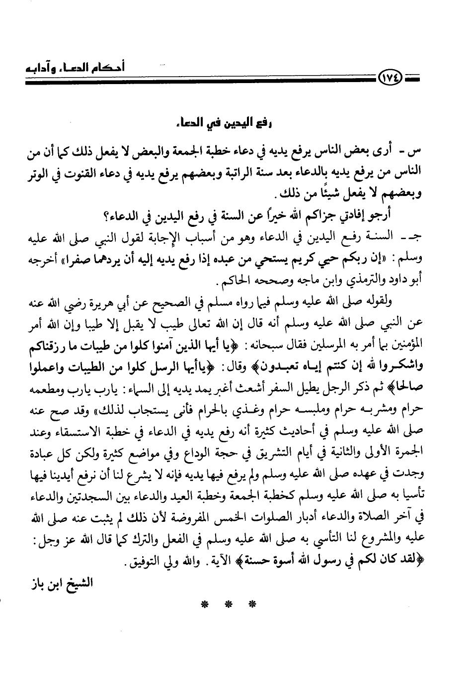 ولقوله، - صلى الله عليه وسلم -، فيما رواه مسلم في الصحيح عن أبي هريرة رضي الله عنه عن النبي، - صلى الله عليه وسلم -، أنه قال إن الله تعالى طيب لا يقبل إلا طيبا وإن الله أمر المؤمنين بما أمر به المرسلين فقال سبحانه {يا أيها الذين آمنوا كلوا من طيبات ما رزقناكم واشكروا الله إن كنتم إياه تعبدون} . وقال {يا أيها الرسل كلوا من الطيبات واعملوا صالحا} ثم ذكر الرجل يطيل السفر أشعث أغبر يمد يديه إلى السماء يارب يارب ومطعمه حرام ومشربه حرام وملبسه حرام وغذي بالحرام فأني يسجاب لذلك " وقد صح عنه، - صلى الله عليه وسلم -، في أحاديث كثيرة أن رفع يديه في الدعاء في خطبة الاستسقاء وعند الجمرة الأولى والثانية في أيام التشريق في حجة الوداع وفي مواضع كثيرة ولكن كل عبادة وجدت في عهده، - صلى الله عليه وسلم -، ولم يرفع فيها يديه فإنه لا يشرع لنا أن نرفع أيدينا فيها تأسيا به، - صلى الله عليه وسلم -، كخطبة الجمعة وخطبة العيد والدعاء بين السجدتين والدعاء في آخر الصلاة والدعاء أدبار الصلوات الخمس المفروضة لأن ذلك لم يثبت عنه، - صلى الله عليه وسلم -، والمشروع لنا التأسي به، - صلى الله عليه وسلم -، في الفعل والترك كما قال الله عزو جل {لقد كان لكم في رسول الله أسوة حسنة} . الآية. الله ولي التوفيق