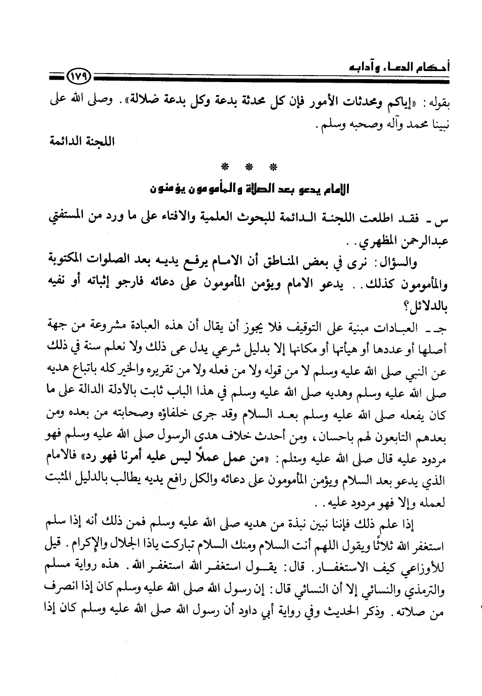 ج- العبادات مبنية على التوقيف فلا يجوز أن يقال أن هذه العبادة مشروعة من جهة أصلها أو عددها أو هيأتها أو مكانها إلا بدليل شرعي يدل على ذلك ولا نعلم سنة في ذلك عن النبي، - صلى الله عليه وسلم -، وهديه، - صلى الله عليه وسلم -، في هذا الباب ثابت بالأدلة الدالة على ما كان يفعله، - صلى الله عليه وسلم -، بعد السلام وقد جرى خلفاؤه وصحابته من بعده ومن بعدهم التابعون لهم باحسان، ومن أحدث خلاف هدى، - صلى الله عليه وسلم -، فهو مردود عليه قال، - صلى الله عليه وسلم -، {من عملا عملاً ليس عليه أمرنا فهو رد} فالامام الذي يدعو بعد السلام ويؤمن المأمومون على دعائه والكل رافع يديه يطالب بالدليل المثبت لعمله وإلا فهو مردود عليه.