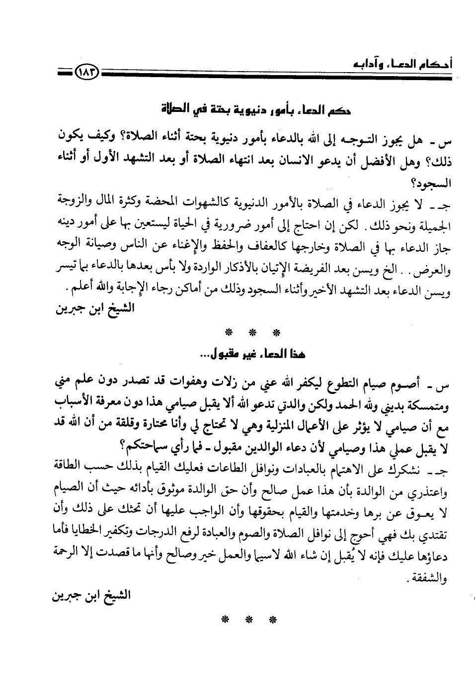 ج- لا يجوز الدعاء في الصلاة بالأمور الدنيوية كالشهوات المحضة وكثرة المال والزوجة الجميلة ونحو ذلك.. لكن إن احتاج إلى أمور ضرورية في الحياة ليستعين بها على أمور دينه جاز الدعاء بها في الصلاة وخارجها كالعفاف والحفظ والإغناء عن الناس وصيانة الوجه والعرض.. الخ ويسن بعد الفريضة الإتيان بالأذكار الواردة ولا بأس بعدها بالدعاء بما تيسر ويسن الدعاء بعد التشهد الأخير وأثناء السجود وذلك من أماكن رجاء الإجابة والله أعلم.
