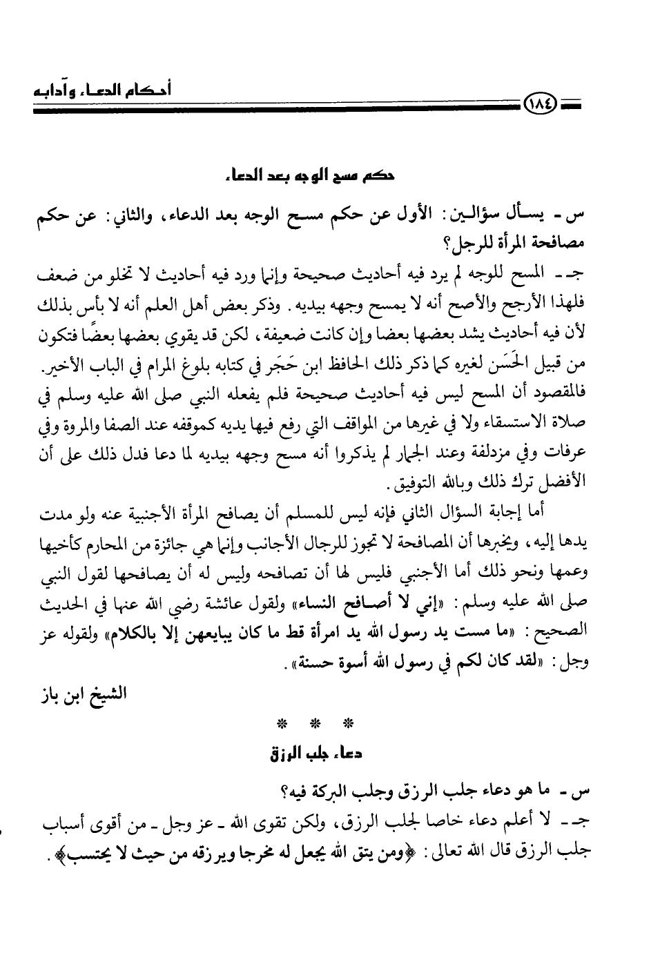 س - يسأل سؤالين الأول عن حكم مسح الوجه بعد الدعاء، والثاني عن حكم مصافحة المرأة للرجل؟