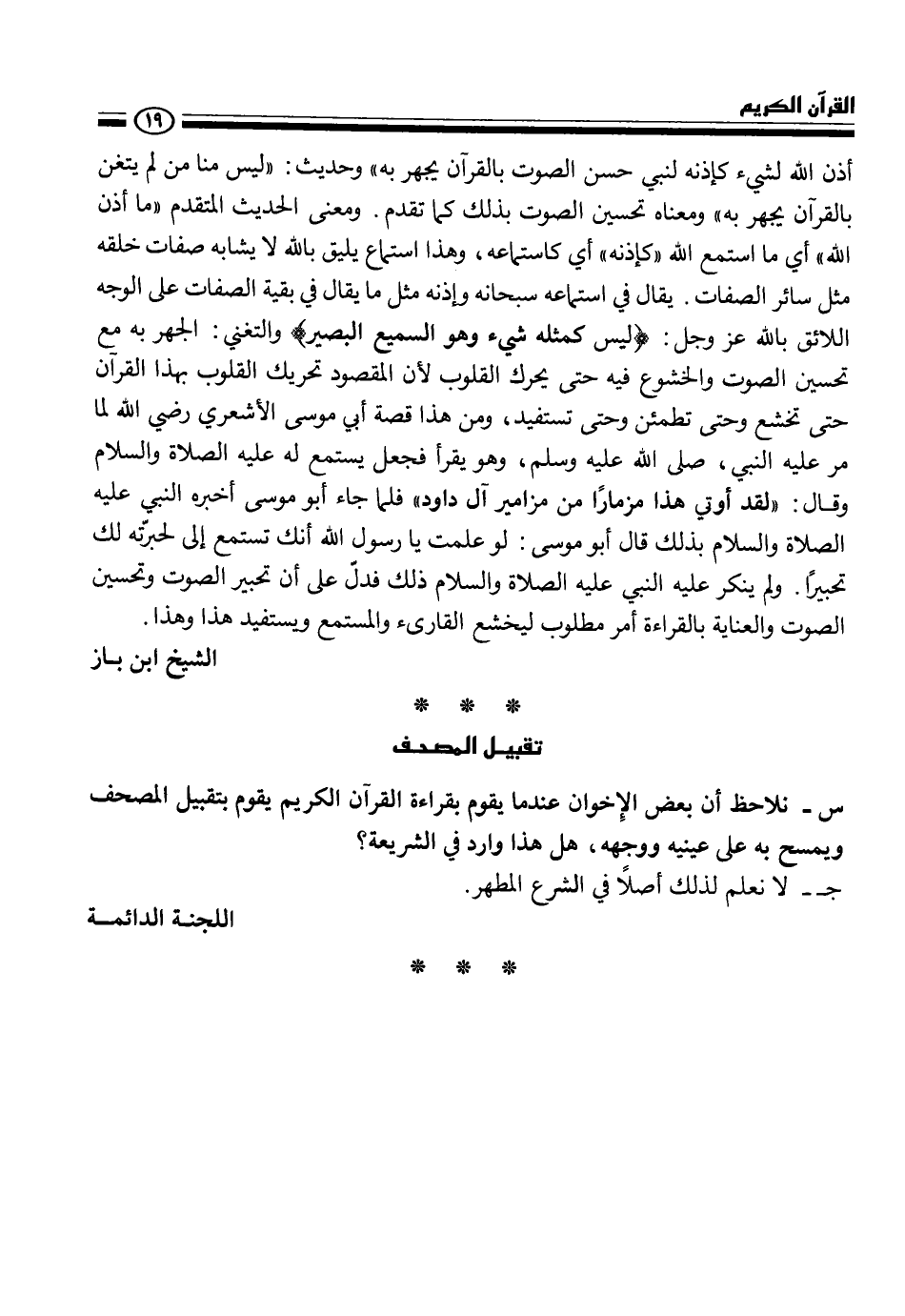 أذن الله لشيئ كإذنه لنبي حسن الصوت بالقرآن يجهر به} وحديث {ليس منا من لم يتغن بالقرآن يجهر به} ومعناه تحسن الصوت كما تقدم. ومعنى الحديث المتقدم {ما أن الله} أي ما استمتع الله {كإذنه} أي كستماعه، وهذا استماع يليق بالله لا يشابه صفات خلقه اللائق بالله عز وجل {ليس كمثله شيئ وهو السميع البصير} والتغني الجهر به مع تحسين الصوت والخشوع فيه حتى يحرك القلوب لأن المقصود تحريك القلوب بهذا القرآن حتى تخشع وحتى تطمئن وحتى تستفيد، ومن هذا قصة أبي موسى الأشعري رضي الله لما مر عليه النبي، - صلى الله عليه وسلم -، وهو يقرأ فجعل يستمع له عليه الصلاة والسلام بذلك قال أبو موسى لو علمت يا رسول الله أنك تستمتع إلى لحبرته لك تحبيراً. ولم ينكر عليه النبي عليه الصلاة والسلام ذلك فدل على أن تحبير الصوت وتحسين الصوت والعناية بالقراءة أمر مطلوب ليخشع القارئ والمستمع ويستفيد هذا وهذا.