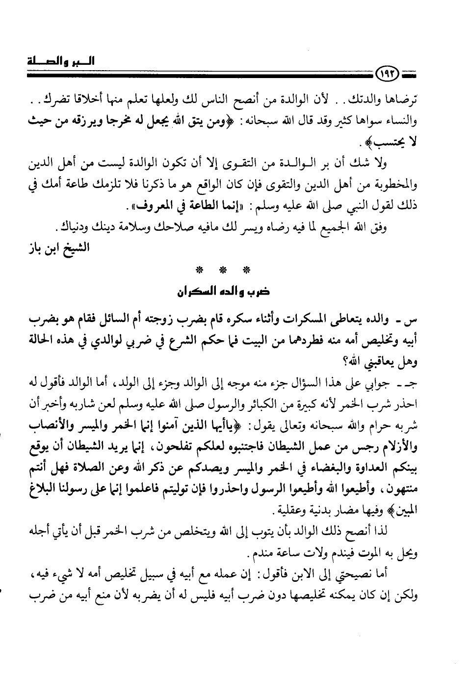 أما نصحيتى إلى الأبن فأقول إن عمله مع أبيه في سبيل تخليص أمه لا شيء فيه، ولكن إن كان يمكنه تخليصها دون ضرب أبيه فليس له أن يضربه لأن منع أبيه من ضرب