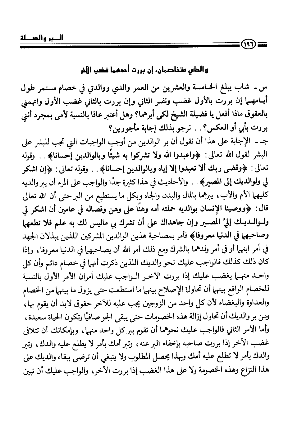ج- الإجابة على هذا أن نقول أن بر الوالدين من أوجب الواجبات التي تجب للبشر على البشر لقول الله تعالى {واعبدوا الله ولا تشركوا به شيئا وبالوالدين إحسانا} .. وقوله تعالى " وقضى ربك ألا تعبدوا إلا إياه وبالوالدين إحسانا} .. وقوله تعالى {إن اشرك لي ولوالديك إلى المصير ".. والأحاديث فى هذا كثيرة جداً والواجب على المرء أن يبر والديه كليهما الأم والأب، يبرهما بالمال والبدن والجاه وبكل ما يستطيع من البر حتى أن الله تعالى قال