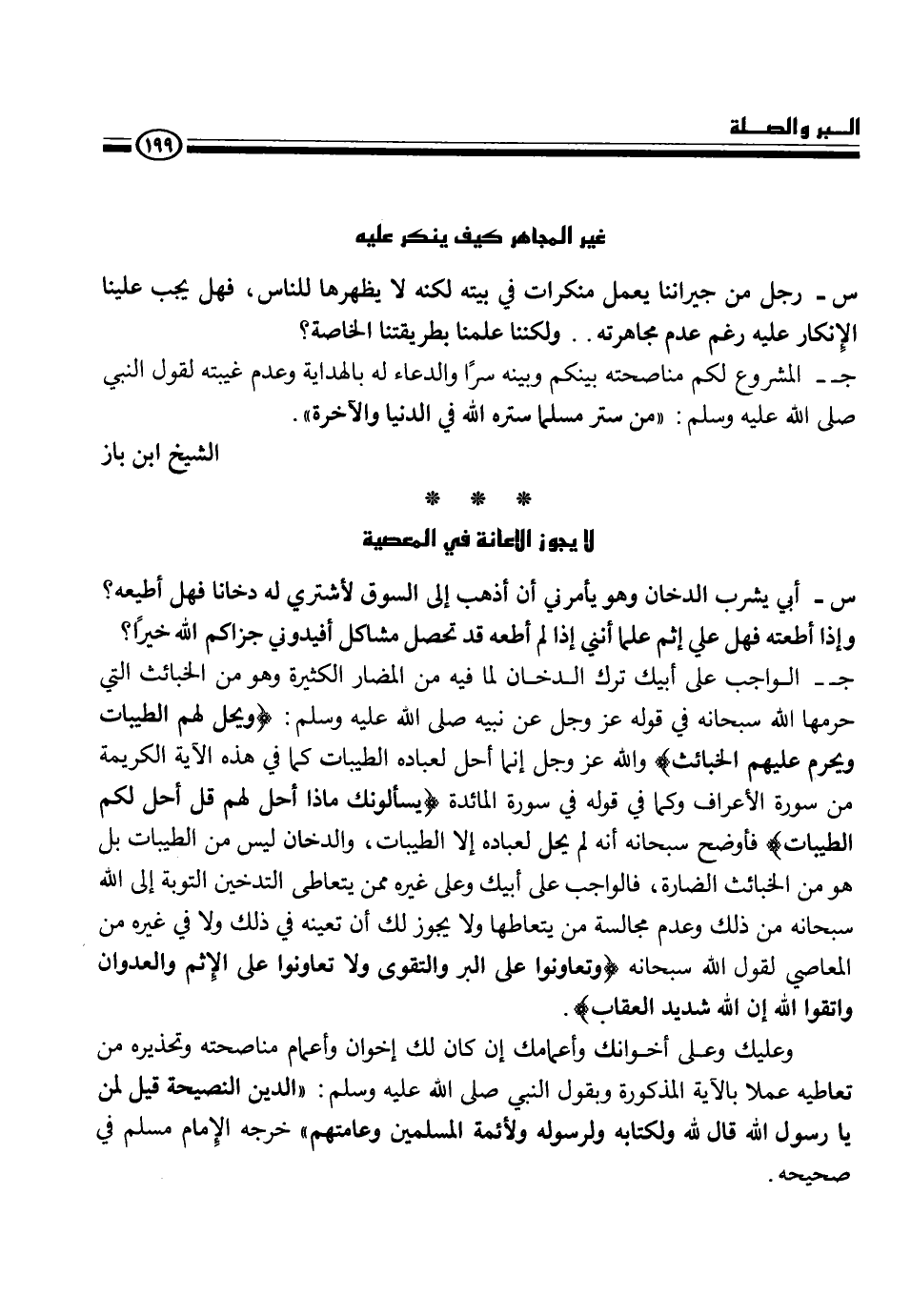 وعليك وعلى أخوانك وأعمامك إن كان لك إخوان وأعمام مناصحته وتحذيره من تعاطيه عملا بالآية المذكورة وبقول النبي، - صلى الله عليه وسلم -، {الدين النصيحة قيل لمن يا رسول الله قال لله ولكتابه ولرسوله ولأئمة المسلمين وعامتهم} خرجه الإمام مسلم في صحيحه.