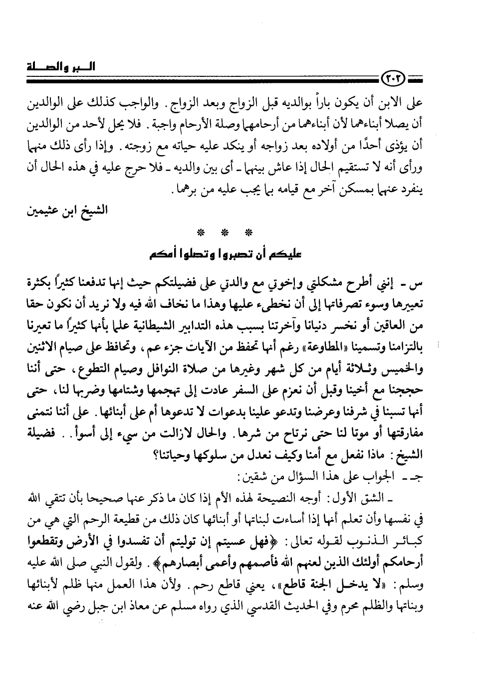 على الأبن أن يكون باراً بوالديه قبل الزواج وبعد الزواج، والواجب كذلك على الوالدين أن يصلا أبناءهما لأن أبناءهما من أرحامهما وصلة الأرحام واجبة. فلا يحل لأحد من الوالدين أن يؤذى أحداً من أولاده بعد زواجه أو ينكد عليه حياته مع زوجته. وإذا رأى ذلك منهما ورأى أنه لا تستقيم الحال إذا عاش بينهما - أي بين والديه - فلا حرج عليه في هذه الحال أن ينفرد عنهما بمسكن آخر مع قيامه بما يجب عليه من برهما.