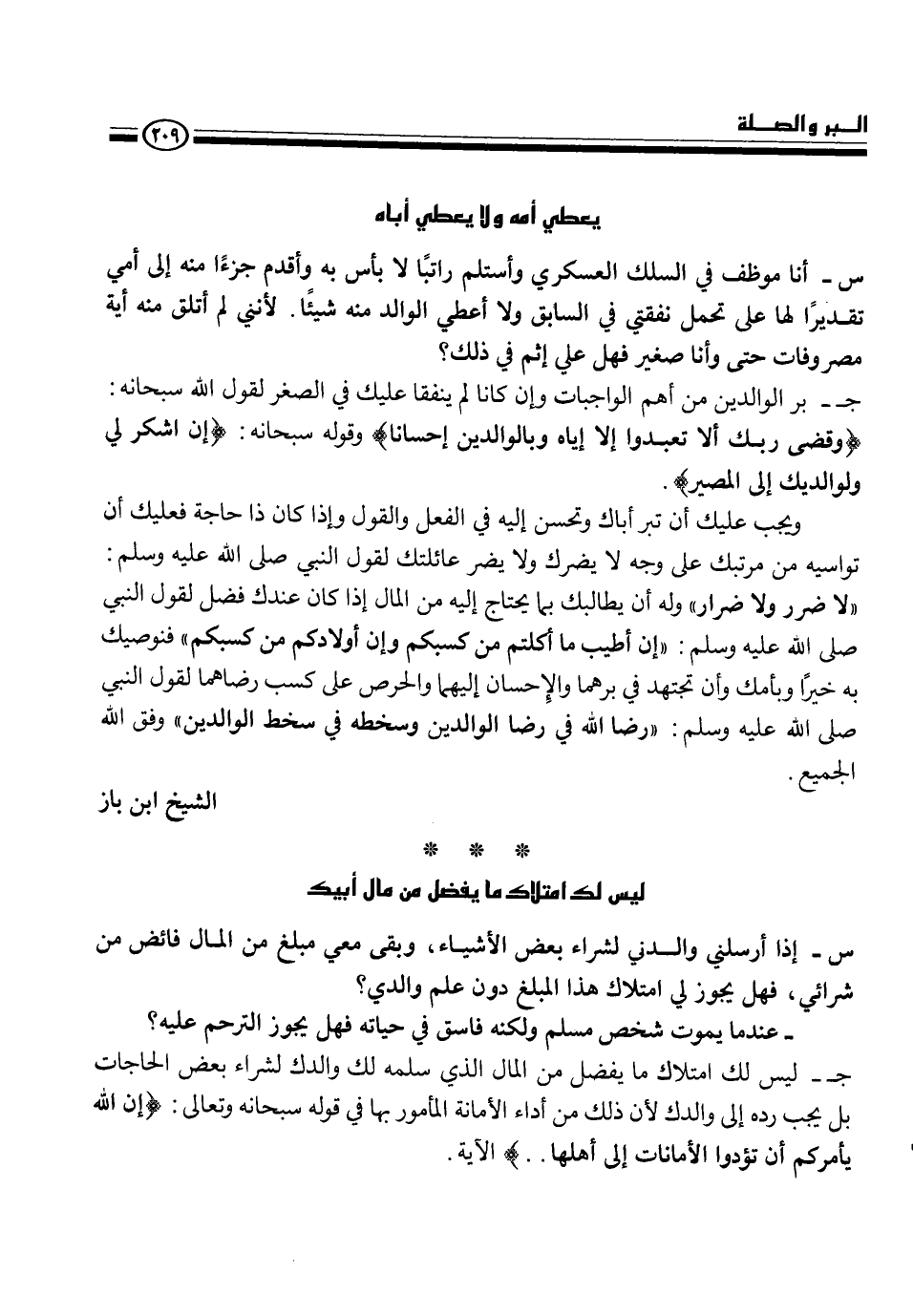 ويجب عليك أن تبر أباك وتحسن إليه في الفعل والقول وإذا كان ذا حاجة فعليك أن تواسيه من مرتبك على وجه لا يضرك ولا يضر عائلتك لقول النبي، - صلى الله عليه وسلم -، {لا ضرر ولا ضرار} وله أن يطالبك بما يحتاج إليه من المال إذا كان عندك فضل لقول النبي، - صلى الله عليه وسلم -، {إن أطيب ما أكلتم من كسبكم وإن أولادكم من كسبكم} فنوصيك به خيراً وبأمك وأن تجتهد في برهما والإحسان إليهما والحرص على كسب رضاهما لقول النبي، - صلى الله عليه وسلم -، {رضا الله في رضا الوالدين وسخطه في سخط الوالدين} . وفق الله الجميع.