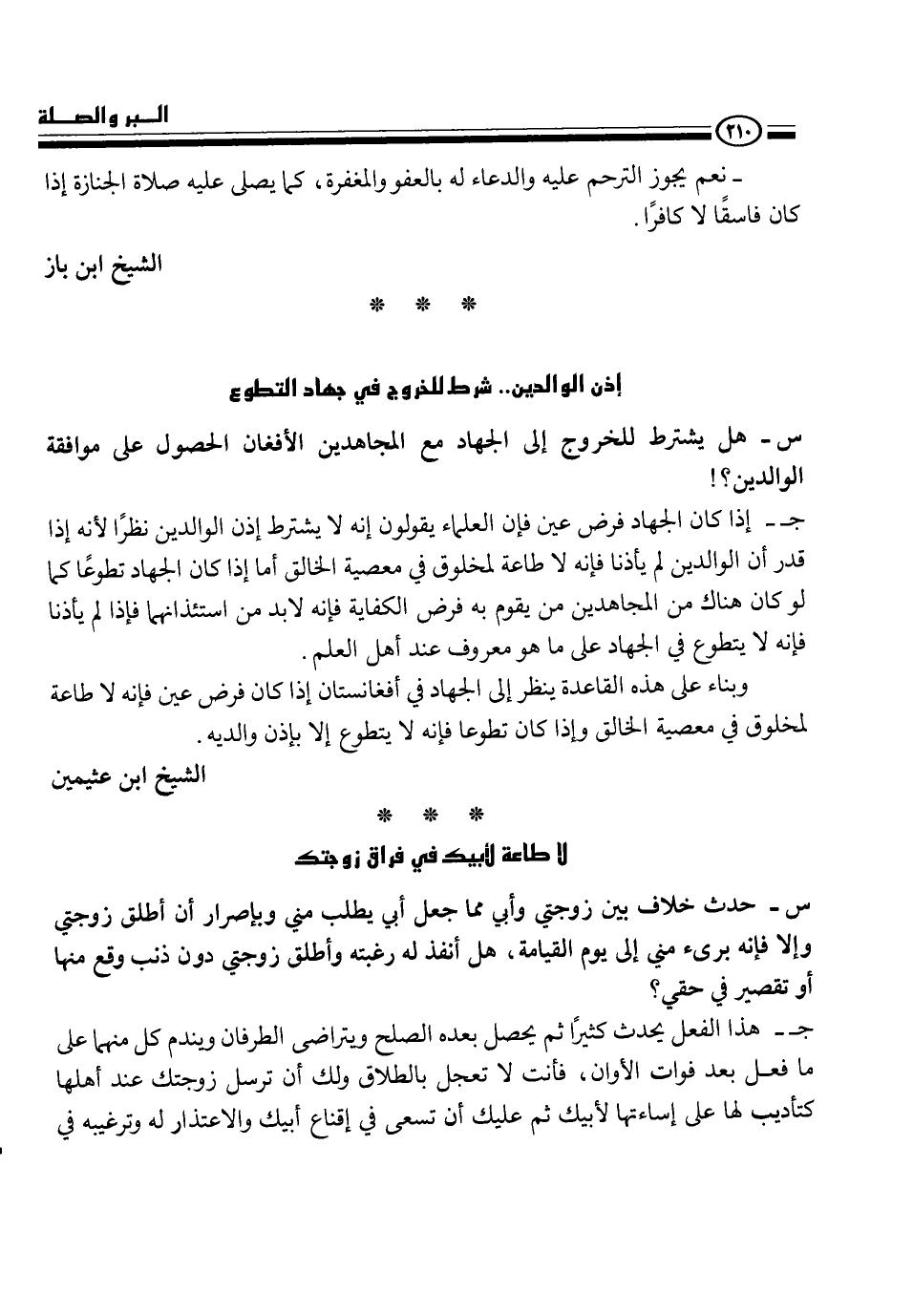 ج- إذا كان الجهاد فرض عين فإن العلماء يقولون إنه لا يشترط إذن الوالدين نظراً لأنه إذا قدر أن الوالدين لم يأذنا فإنه لا طاعة لمخلوق في معصية الخالق أما إذا كان الجهاد تطوعاً كما لو كان هناك من المجاهدين من يقوم به فرض الكفاية فإنه لابد من استئذانهما فإذا لم يأذنا فإنه لا يتطوع في الجهاد على ما هو معروف عند أهل العلم.