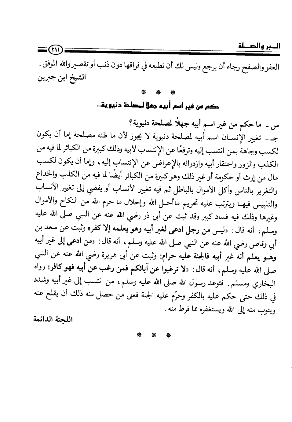 ج- تغيير الإنسان اسم أبيه لمصلحة دنيوية لا يجوز لأن ما ظنه مصلحة إما كان يكون لكسب وجاهة بمن انتسب إليه وترفعاً عن الإنتساب لأبيه وذلك كبيرة من الكبائر لما فيه من الكذب والزور واحتقار أبيه وازدرائه بالإعراض عن الإنتساب إليه، وإما أن يكون لكسب مال من إرث أو حكومة أو غير ذلك وهو كبيرة من الكبائر أيضا لما فيه من الكذب والخداع والتغرير بالناس وأكل الأموال بالباطل ثم فيه تغيير الأنساب أو يفضي إلى تغيير الأنساب والتلبيس فيها ويترتب عليه تحريم ما أحل الله وإحلال ما حرم الله من النكاح والأموال وغيرها وذلك فيه فساد كبير فقد ثبت عن أبي ذر رضي الله عنه عن النبي، - صلى الله عليه وسلم -، أنه قال {ليس من رجل ادعى لغير أبيه وهو يعلمه إلا كفر} وثبت عن سعد بن أبي وقاص رضي الله عنه عن النبي، - صلى الله عليه وسلم -، أنه قال {من ادعى إلى غير أبيه وهو يعلم أنه غير أبيه فالجنة عليه حرام} وثبت عن أبي هريرة رضي الله عنه عن النبي، - صلى الله عليه وسلم -، أنه قال {لا ترغبوا عن آبائكم فمن رغب عن أبيه فهو كافر} رواه البخاري ومسلم. فتوعد رسول الله، - صلى الله عليه وسلم -، من أنسب إلى غير أبيه وشدد في ذلك حتى حكم عليه بالكفر وحرم عليه الجنة فعلى من حصل منه ذلك أن يقلع عنه ويتوب منه إلى الله ويستغفره مما فرط منه.