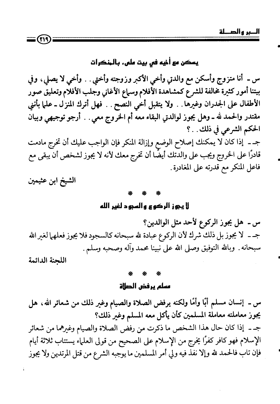 س - أنا متزوج وأسكن مع والدتي وأخي الأكبر وزوجته وأختي.. وأخي لا يصلي، وفي بيننا أمور كثيرة مخالفة للشرع كمشاهدة الأفلام وسماع الأغاني وجلب الأفلام وتعليق صور الأطفال على الجدران وغيرها.. ولا يتقبل أخي النصح.. فهل أترك المنزل - علما بأنني مقتدر والحمد لله - وهل يجوز لوالدتي البقاء معه أم الخروج معي.. أرجو توجيهي وبيان الحكم الشرعي في ذلك..؟