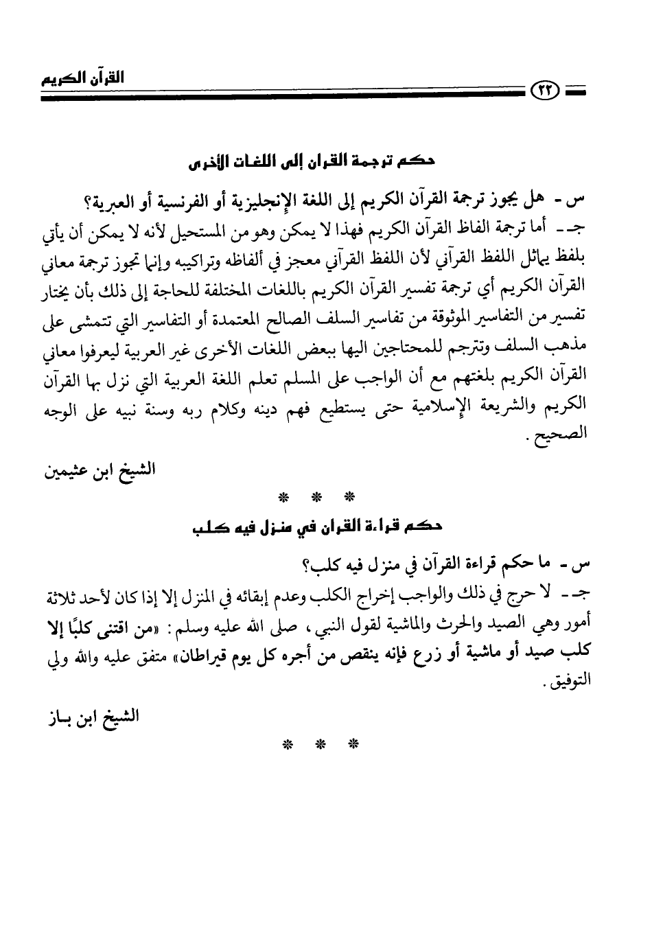 ج- أما ترجمة الفاظ القرآن الكريم فهذا لا يمكن وهو من المستحيل لأنه لا يمكن أن يأتي بلفظ يماثل اللفظ القرآني لأن اللفظ القرآني معجز في ألفاظه وتراكيبه وإنما تجوز ترجمة معاني القرآن الكريم أي ترجمة تفسير القرآن الكريم باللغات المختلفة للحاجة إلى ذلك بأن يختار تفسير من التفاسير المؤثوقة من تفاسير السلف الصالح المعتمدة أو التفاسير التي تتمشى على مذهب السلف وتترجم للمحتاجين إليها ببعض اللغات الأخرى غير العربية ليعرفوا معاني القرآن الكريم بلغتهم مع أن الواجب على المسلم تعلم اللغة العربية التي نزل بها القرآن الكريم والشريعة الإسلامية حتى يستطيع فهم دينه وكلام به وسنة نبيه على الوجه الصحيح.